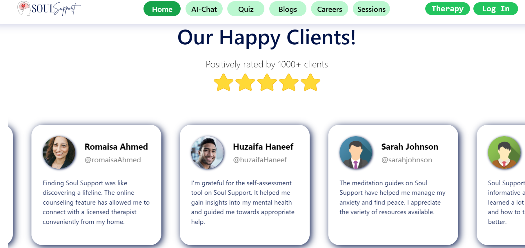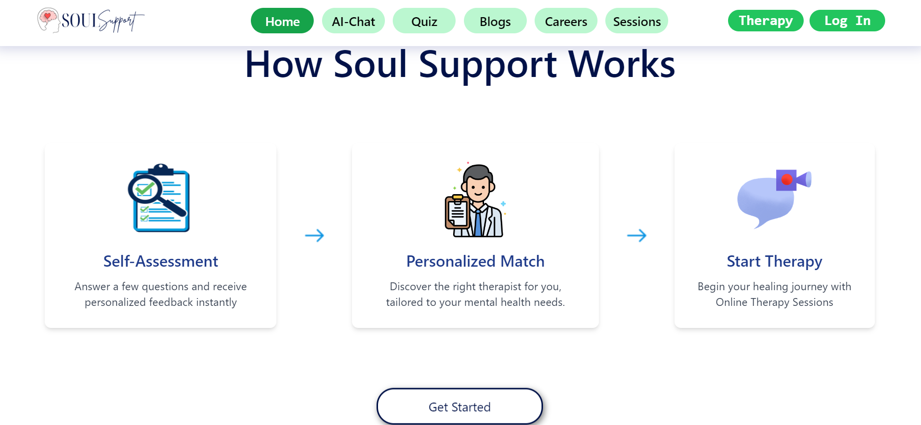 The inspiration for Soul Support came from the growing need for accessible, affordable, and empathetic mental health care. Mental wellness is a fundamental human right, yet many people face barriers such as stigma, cost, and lack of resources. We wanted to create a platform that bridges this gap and empowers individuals to seek help without hesitation while supporting therapists in growing their practices.
