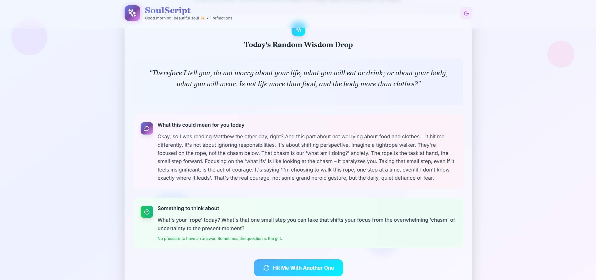 Let's be honest - I didn't set out to build some profound spiritual tool. I was just another burnt-out human drowning in to-do lists, drinking hot coffee at 3 PM while my phone buzzed with notifications. The "aha" moment came when I caught myself Googling "why does everything feel meaningless" for the third time that week. All those productivity apps kept telling me to do more, but what I needed was something to help me be "ME" more. So I built SoulScript - not because I had some grand vision, but because I needed a place where my existential dread could meet something wiser than my Twitter feed.
