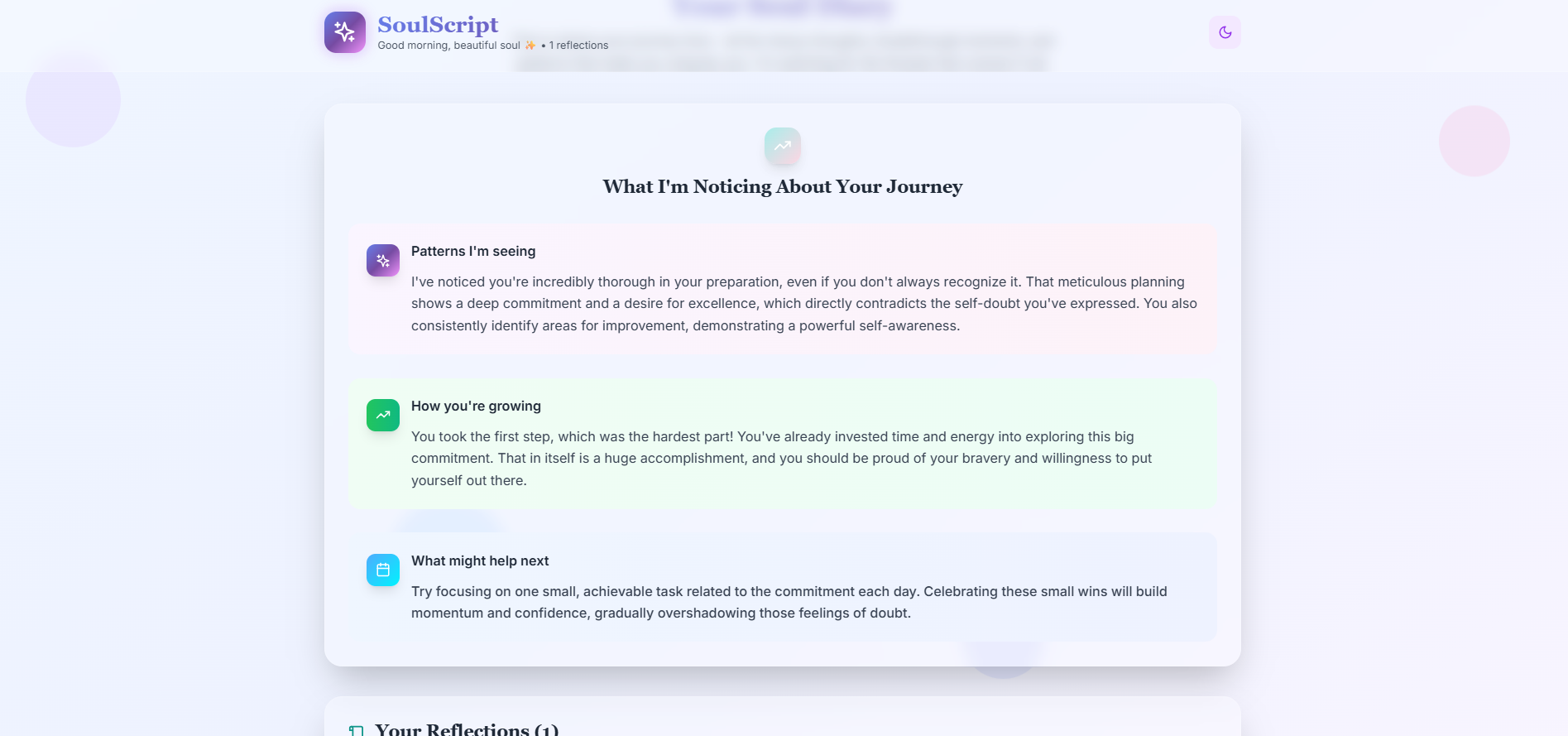 SoulScript is like that one friend who actually listens instead of just waiting for their turn to talk. You dump your messy thoughts ("Why am I like this?"), and it: