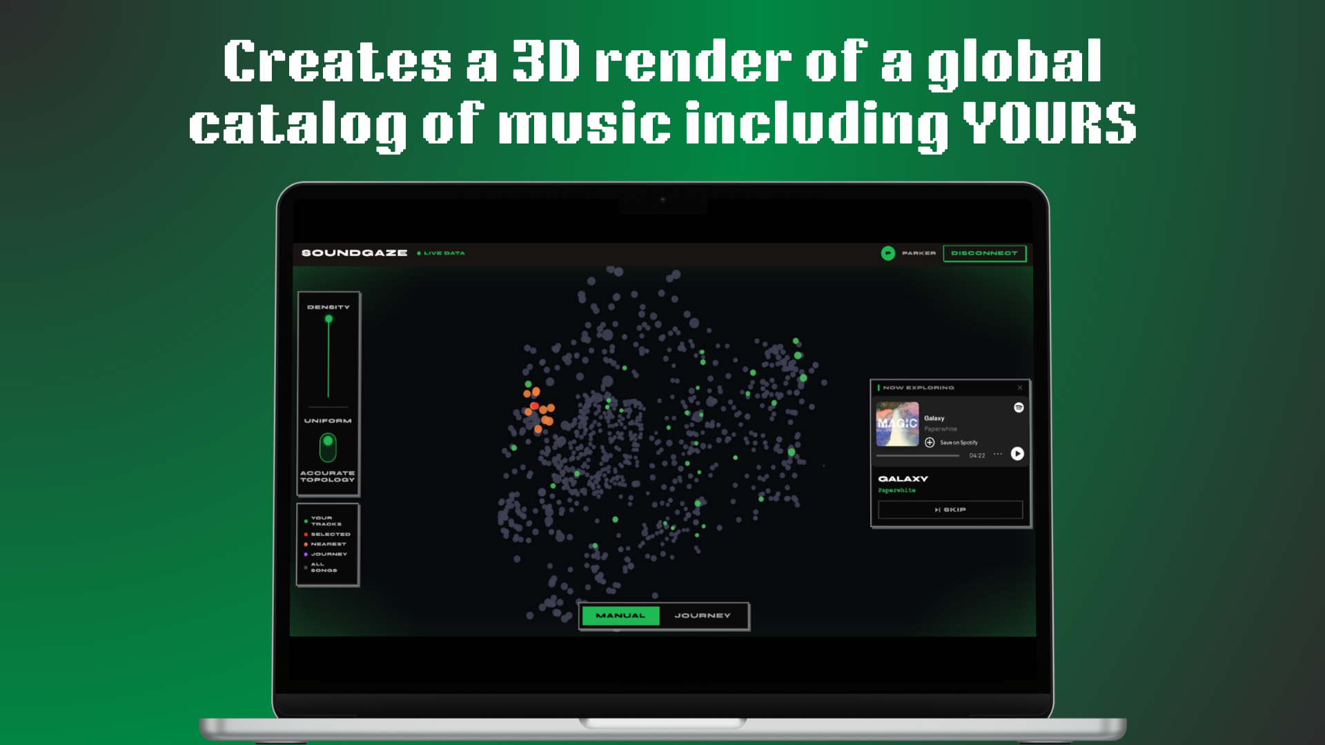Spotify deprecated core audio feature endpoints mid-build, forcing us to consider alternative APIs and live integration issues under time pressure. Achieving perceptually meaningful clustering in 3D was also a headache since raw UMAP projections collapsed into dense, unreadable regions. We solved this through quantile normalization, redistributing point density evenly across space without sacrificing topological integrity.