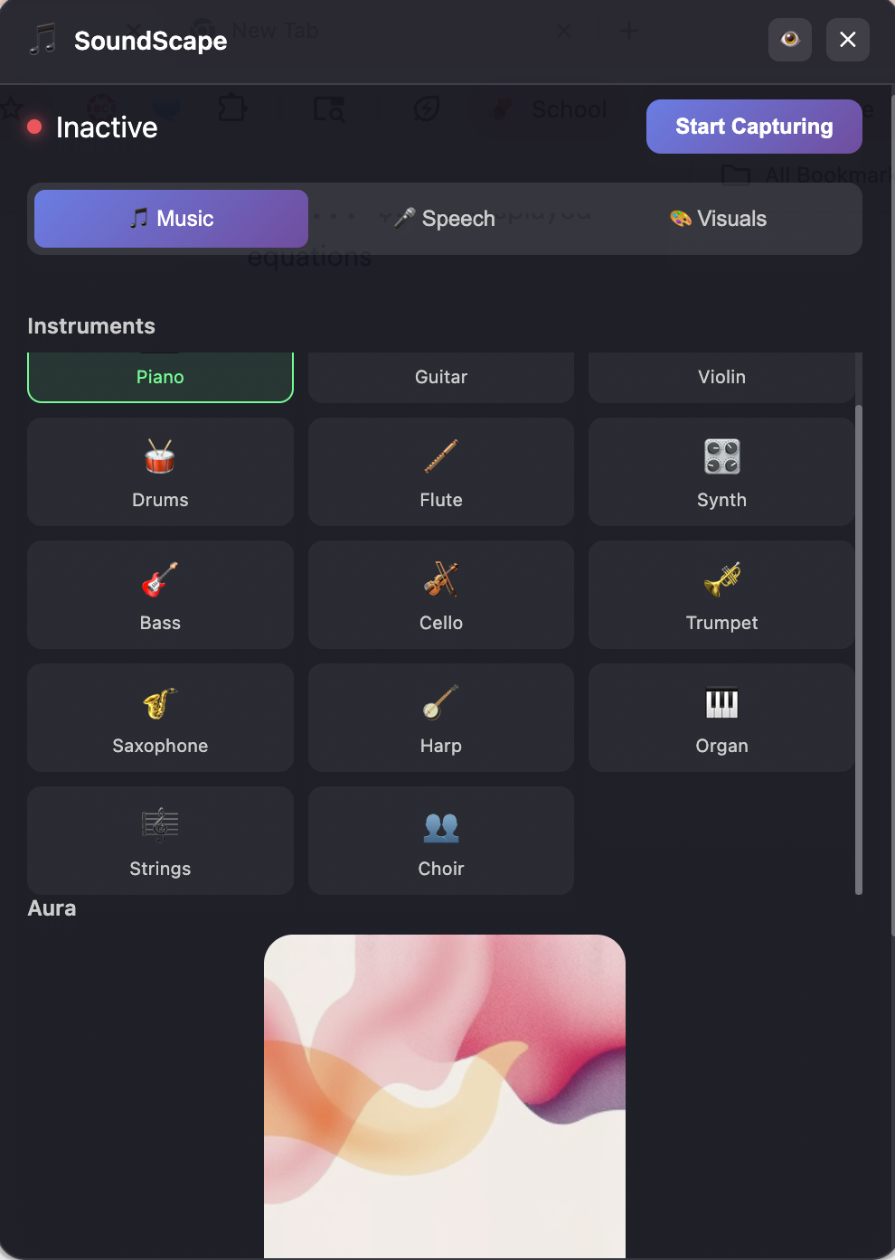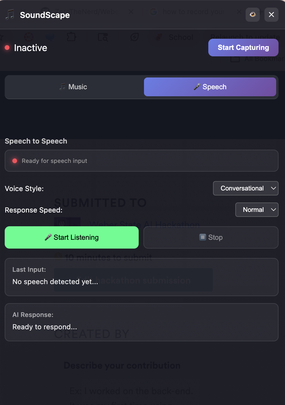 It generates AI music, generates Aura Images with Runware based on the contents of the screen, and Speech to Speech functionality with Eleven Labs