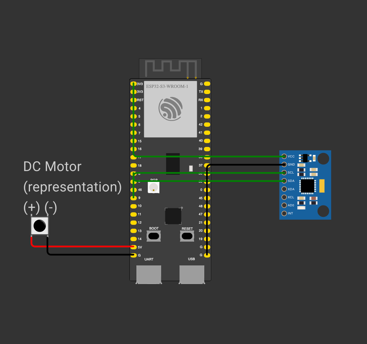 Connected to the ESP-32 is an ABX00101 IMU that is fixed on top of our 3D printed demo bridge. This IMU collects the raw x,y,z data as the bridge moves due to the TT motor we have attached that is spinning with a weight on it. As the motor spins, it sways the bridge in different modes: bold Normal Movement: 3.3V to motor with no weight bold Warning Movement: 3.3V to motor with weight bold Catastrophic/Failing Movement: 5V to motor with weight