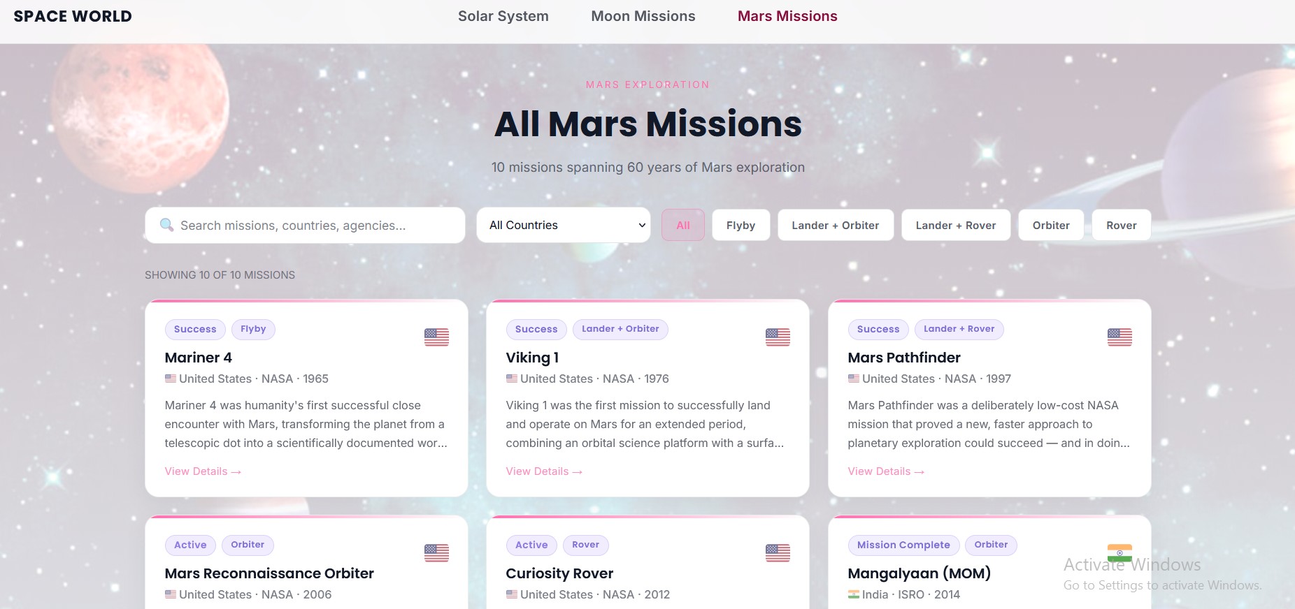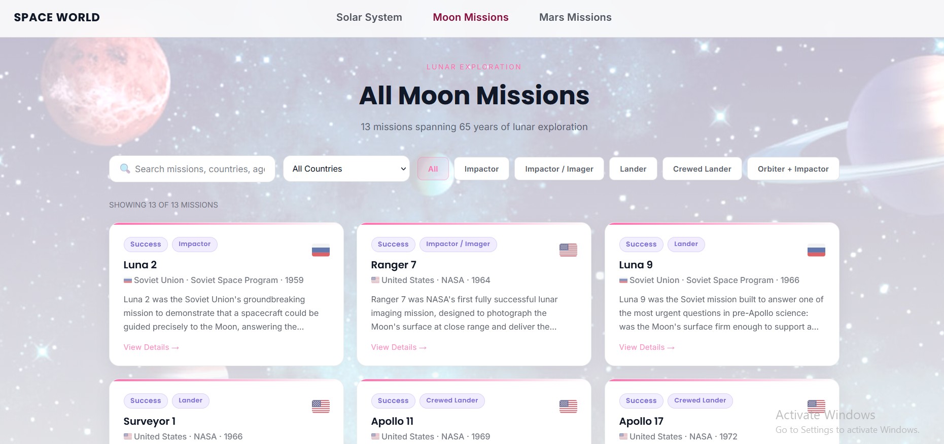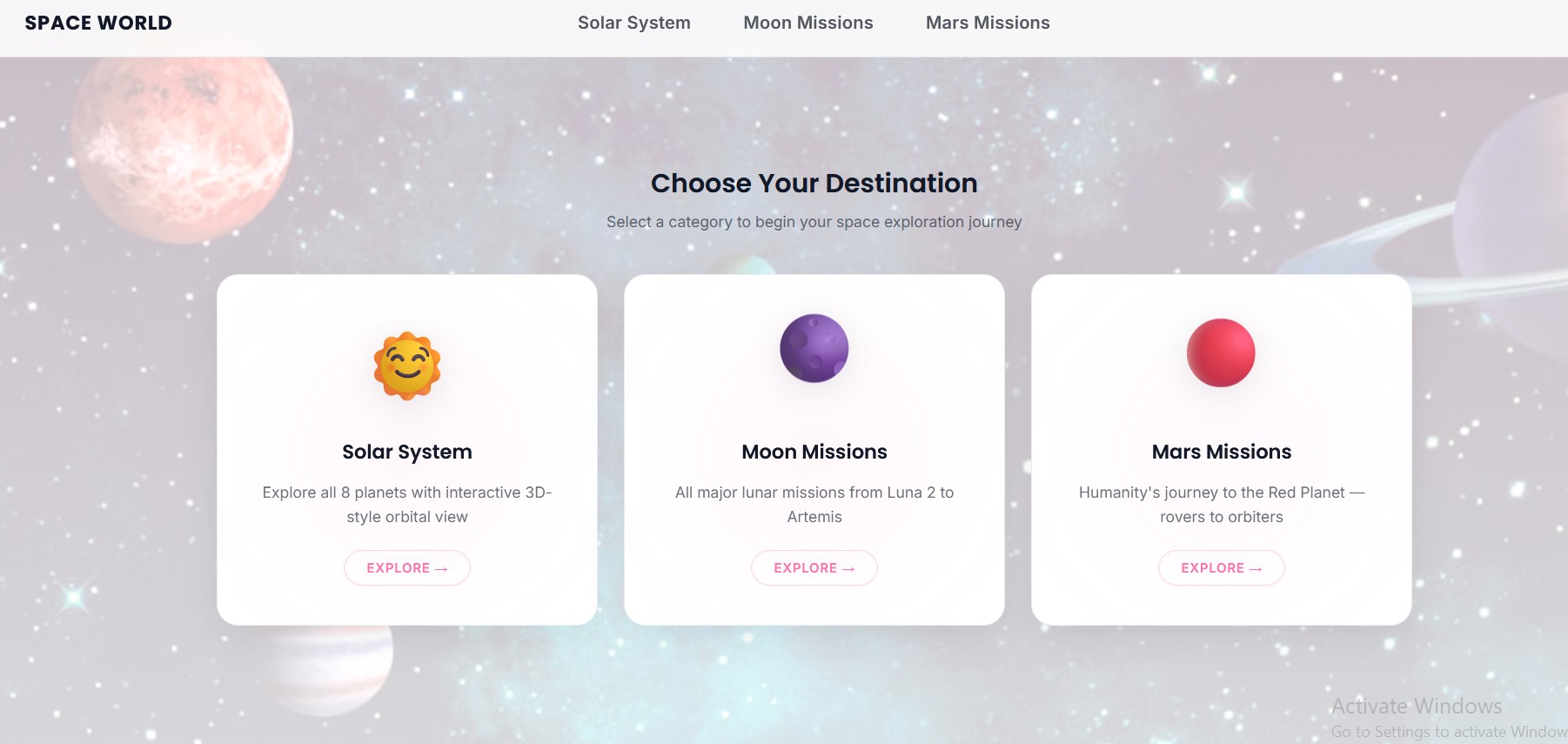 How We Built It We built the platform using React (Vite) for the frontend and Node.js + Express for the backend. The application includes three main sections: Solar System exploration with interactive planets Moon missions with detailed historical data Mars missions with rover and orbital mission insights