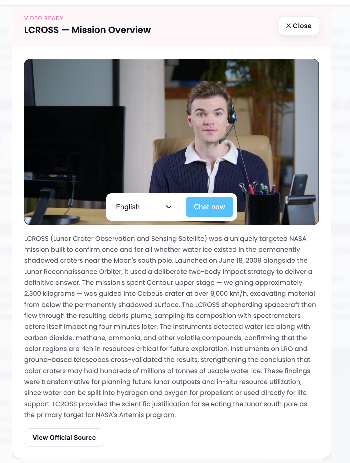 We integrated the LiveAvatar API to power an AI Space Guide that generates spoken explanations of planets and missions. When a user clicks “Watch AI Video Summary,” our backend builds a structured script from mission data and sends it to the LiveAvatar API, which returns a live avatar experience embedded inside the app. We also used NASA official mission sources and YouTube references to ensure educational accuracy and reliability.