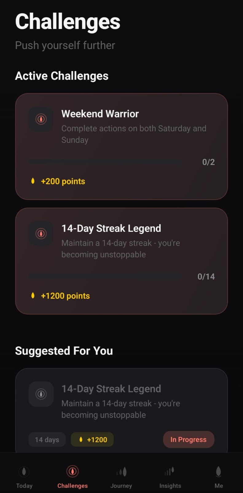 Challenges-Gamified challenges boost consistency and keep users engaged daily.