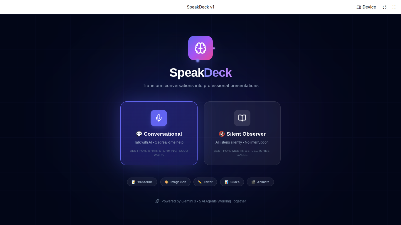 SpeakDeck is a real-time, multi-agent whiteboard that instantly transforms conversational speech and rough sketches into professional, structured presentations.