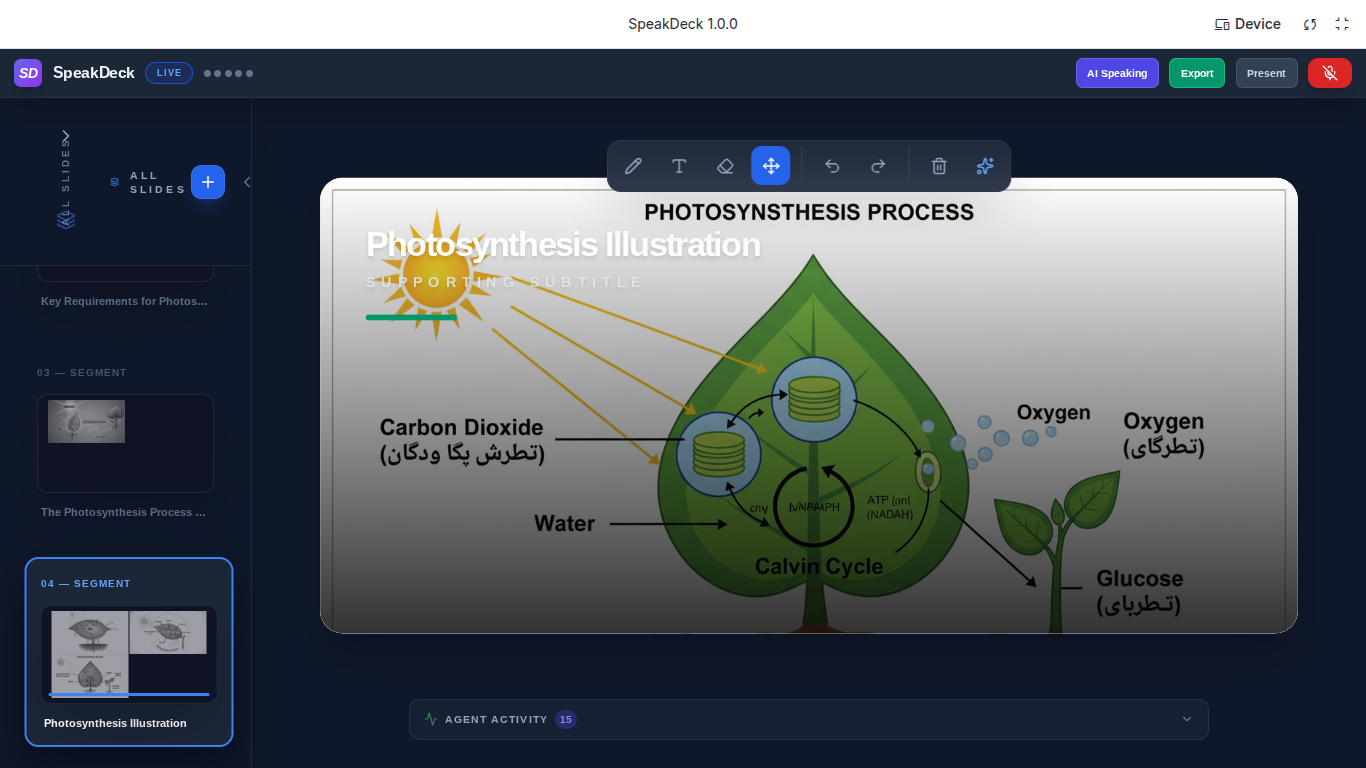 - 🎓 Education (Lecture to Slides): A professor delivers a lecture on biology. SpeakDeck listens silently, detecting the topic, and automatically generates a structured slide deck with anatomical diagrams and key bullet points—ready for students to download immediately.