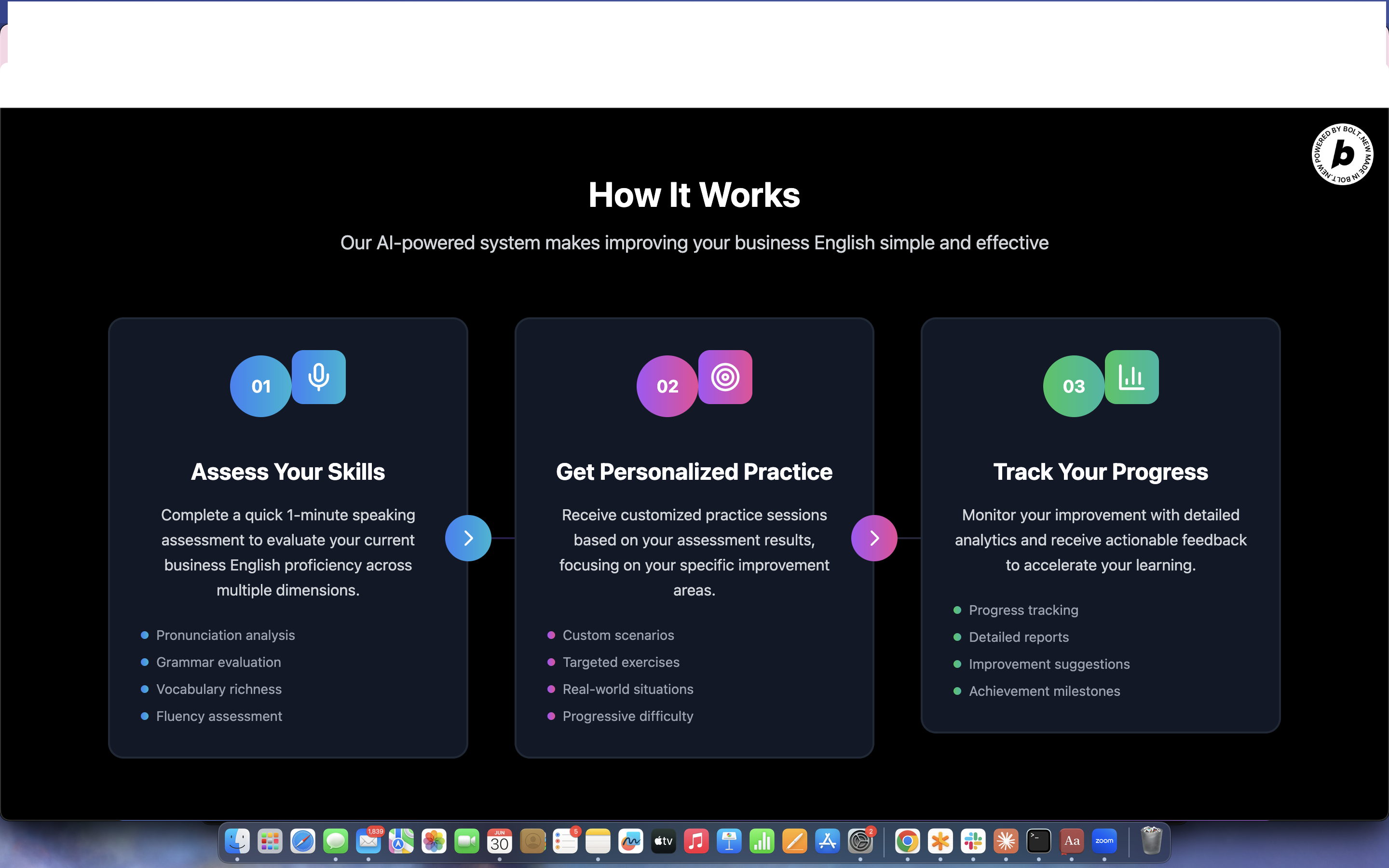 Through Bolt. The app has a landing page with basic sign up/login option explaining the value proposition. Once signed up, You will be directed to the welcome screen which has dashboard, Assessment screen & practise sessions.