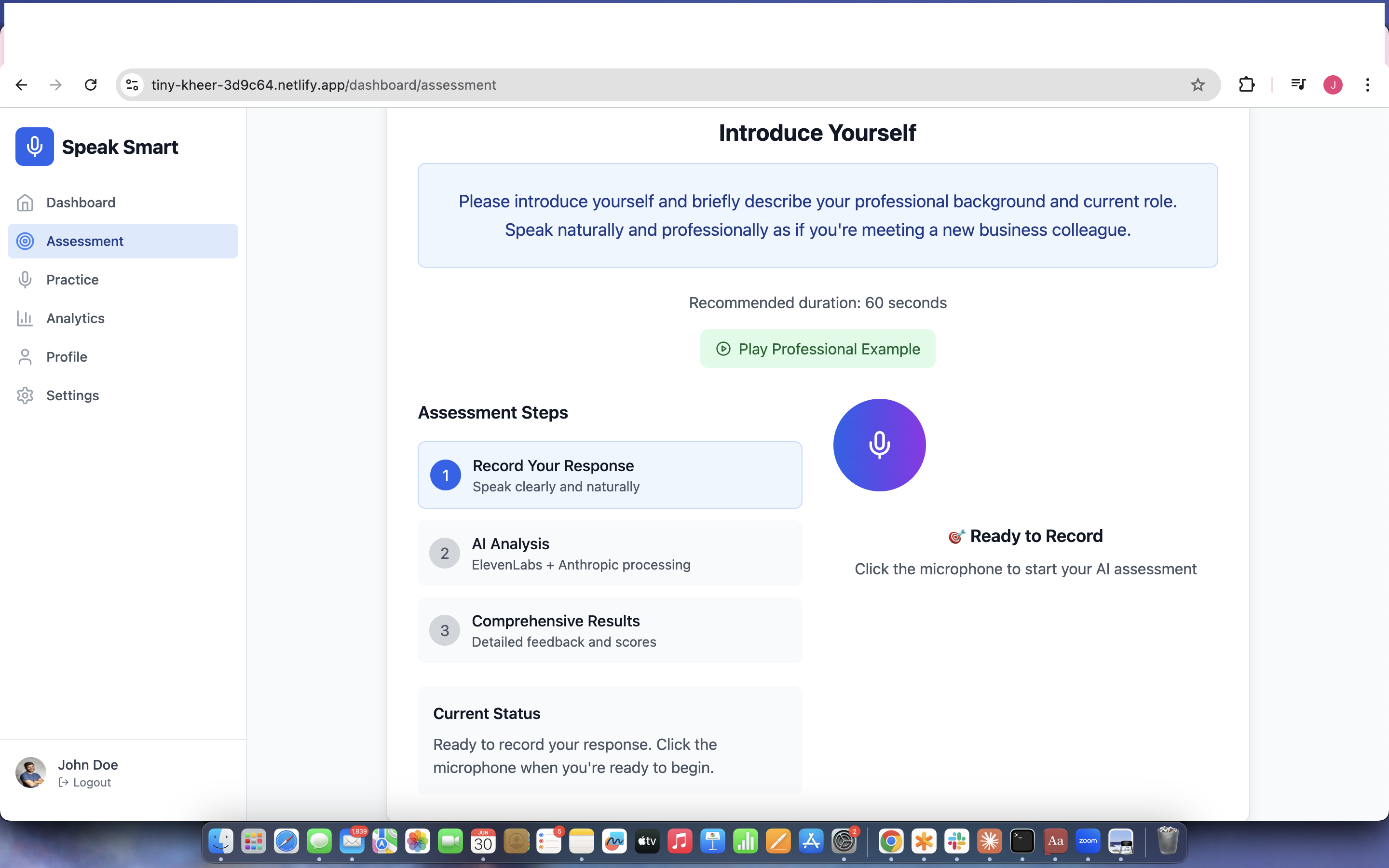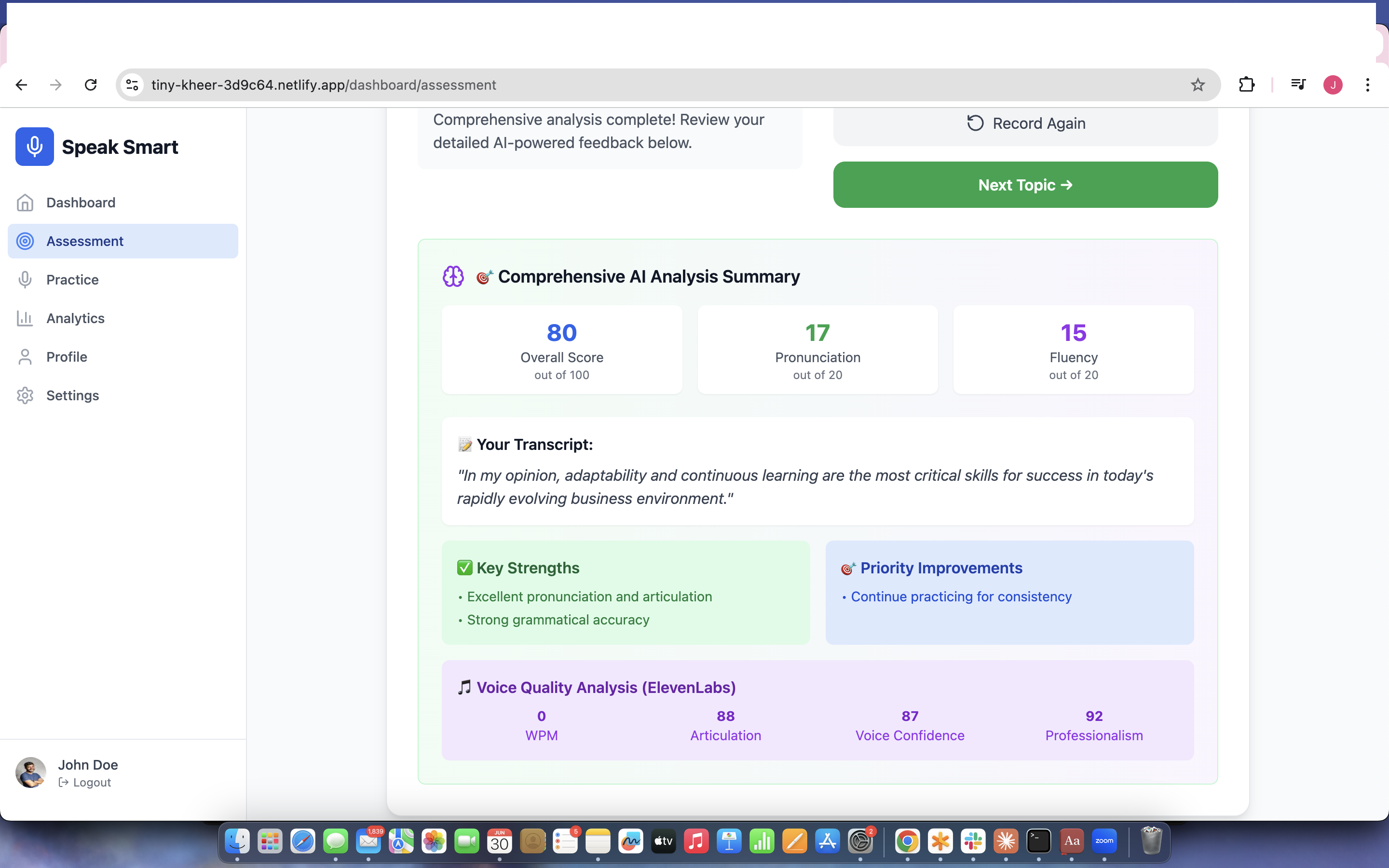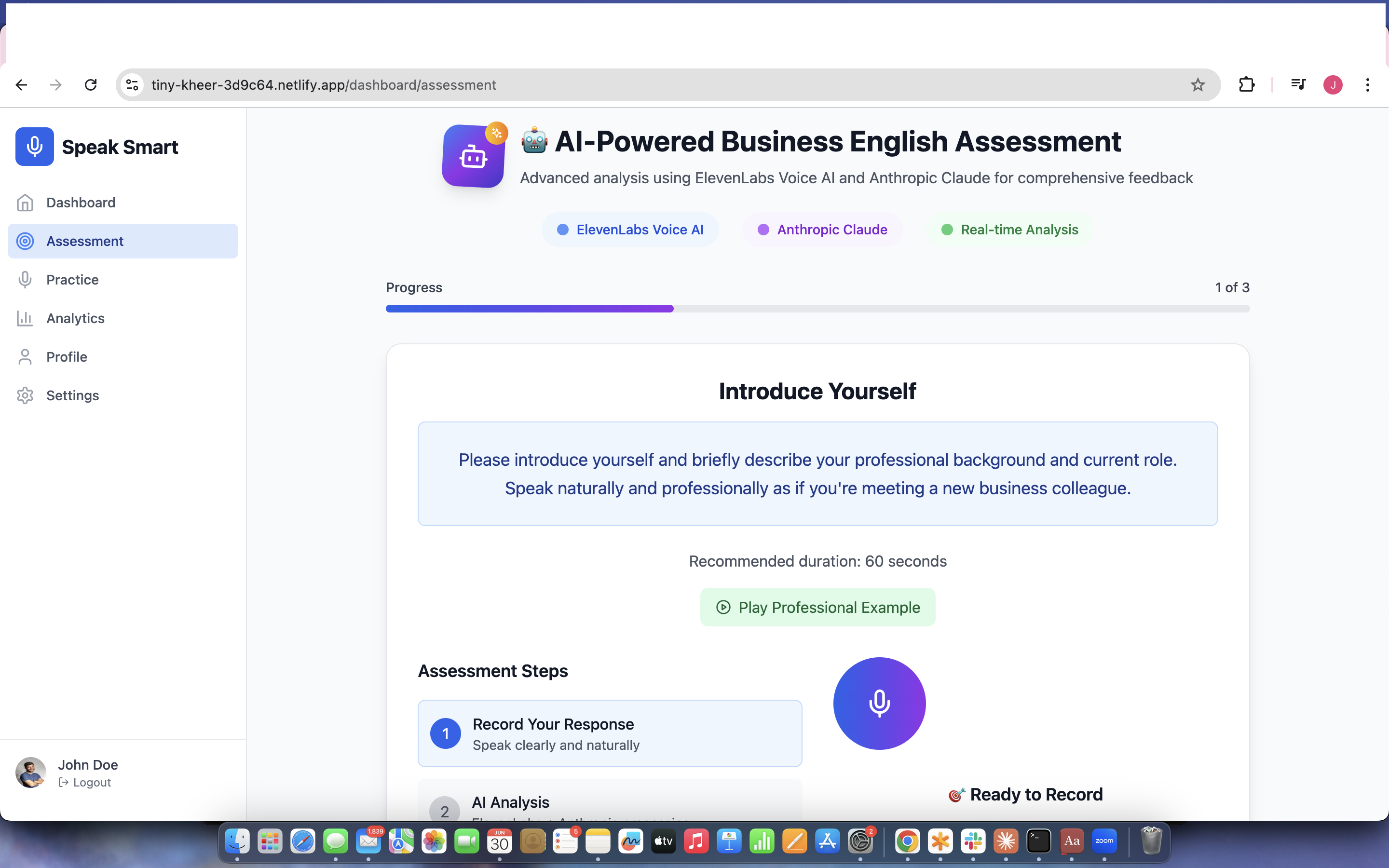 The 1 minute assessment lets you record your speech, and the AI instantly summarises and rates your speech. The practise session has multiple sessions in which you are given the scenario to practise , record and have instant AI assessment.