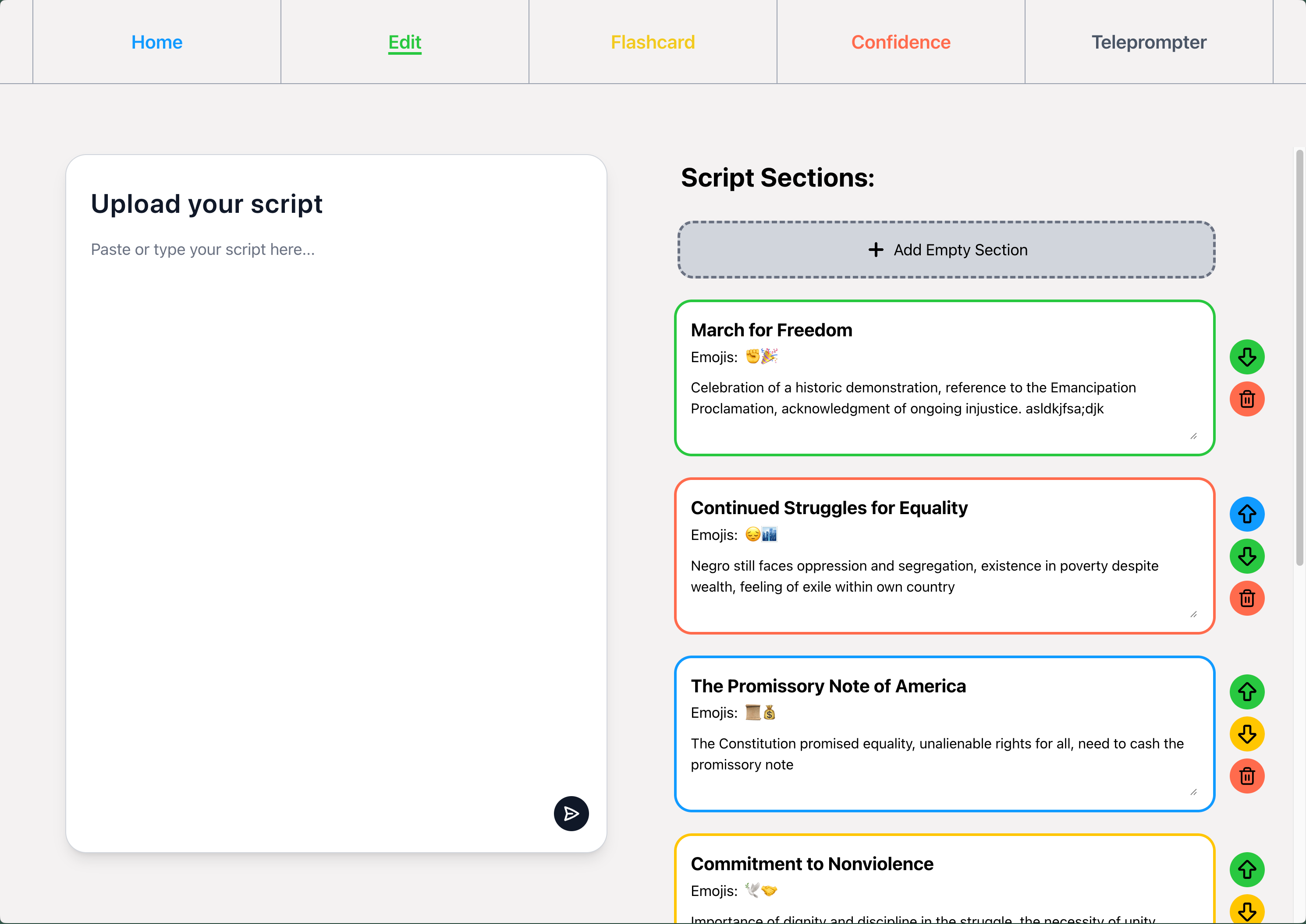 One idea that we wanted to do was to do dynamic teleprompting. Using a transcribing tool, we could record what the user has said and match it to sections in the script. Then, SpeakUp can display the current section's title and visual aid (emoji) and also the next section's title and visual aid.