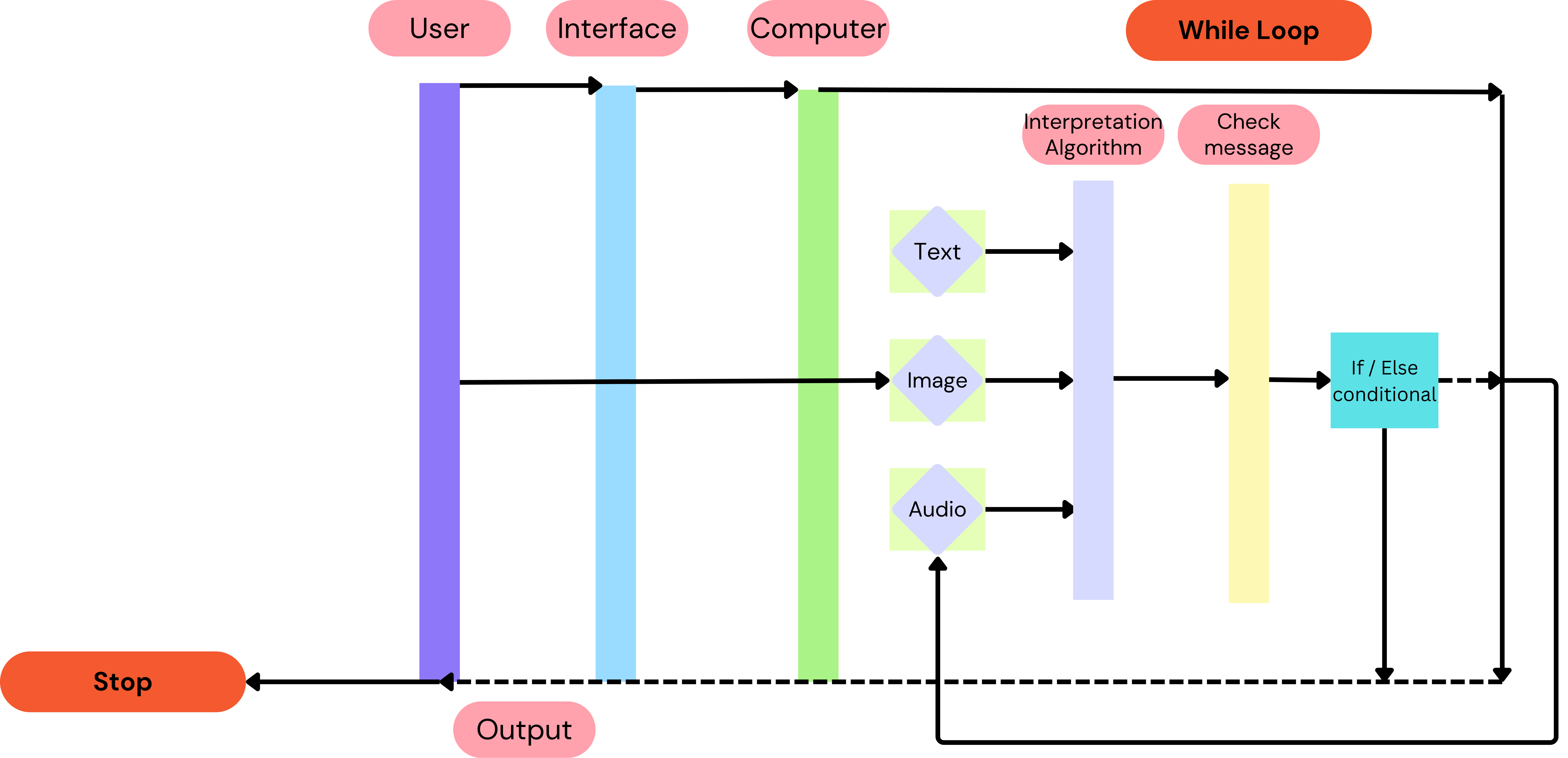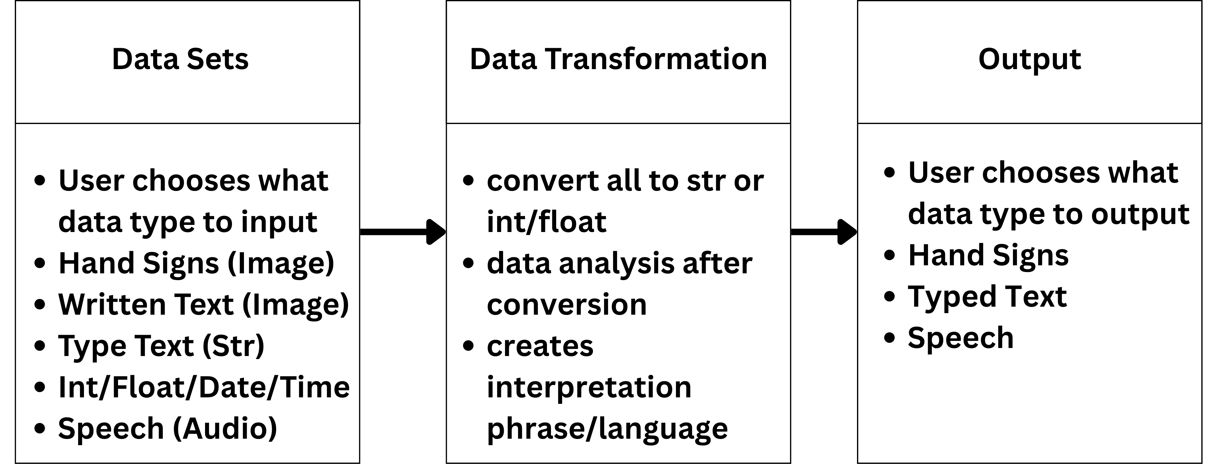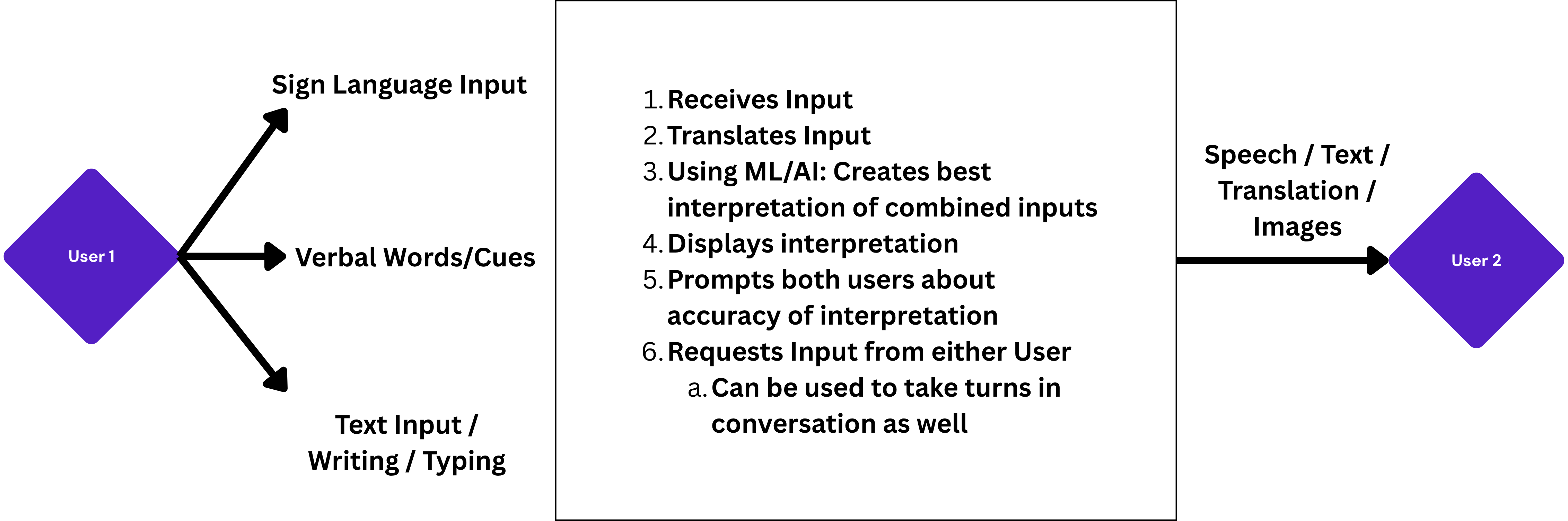 This product takes in users inputs from various sources and interprets it so the other user can speak with the first user in whichever method they prefer whether it be sign language, speech, writing, or typing.