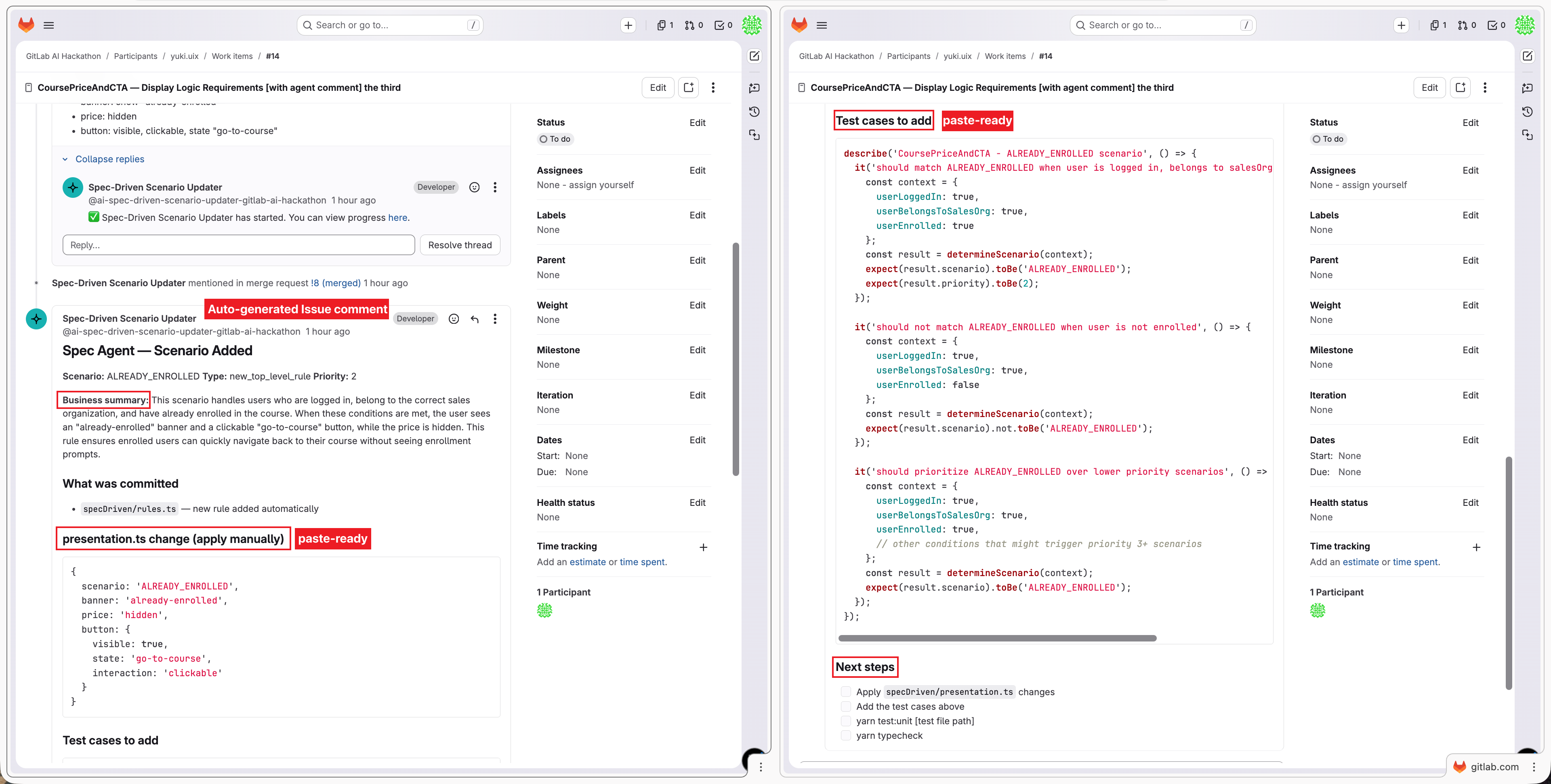 presentation.tscode to apply manually, ready-to-use Jest test cases covering the new scenario, adjacent scenario regression, and fallback behavior, plus a next steps checklist with the MR link