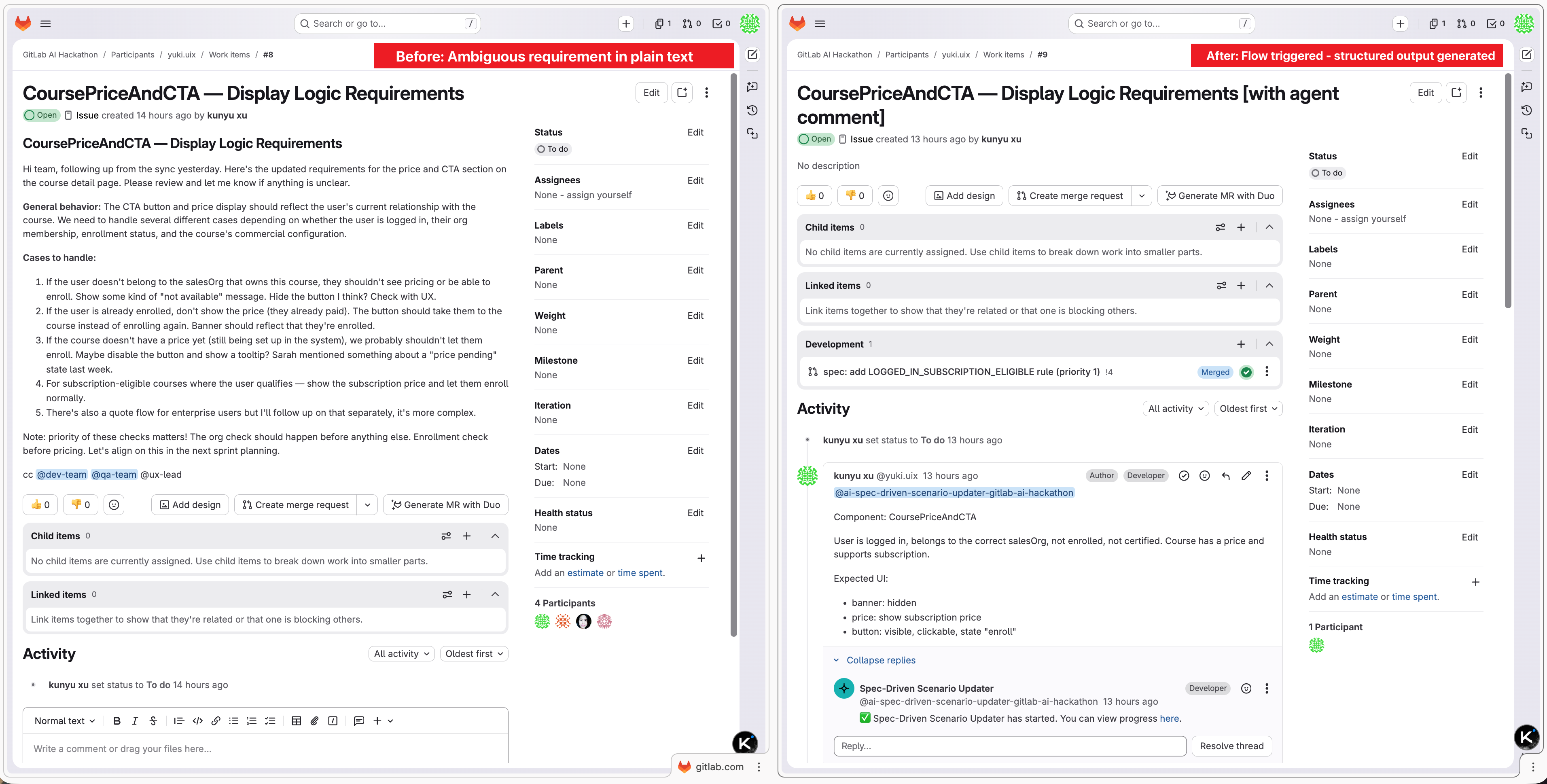 Spec-Driven Scenario Updater is a GitLab Duo Flow that turns natural-language UI scenario descriptions into structured, version-controlled TypeScript spec rules — directly inside your GitLab workflow.
