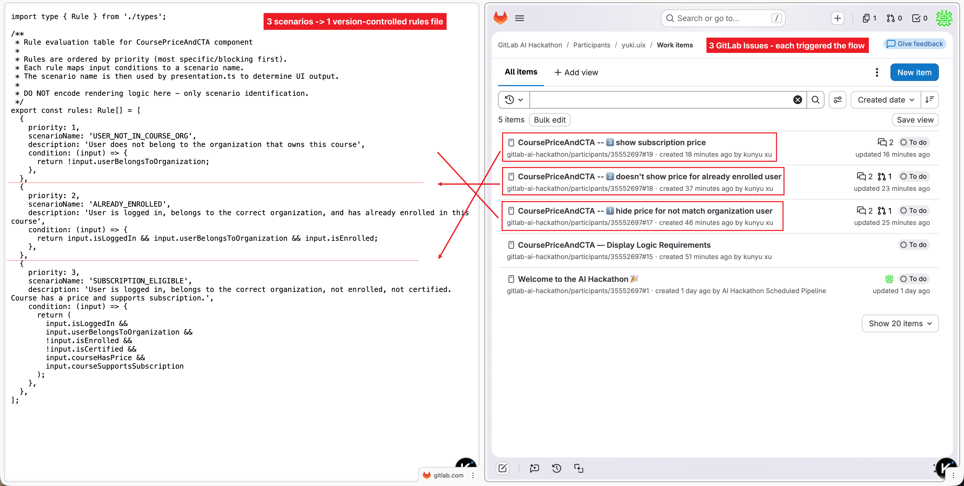 specDriven/rules.tsfrom the repository - Parses the scenario — classifying it as a gate condition (access control), user state condition (enrollment, certification), or course state condition (pricing, subscription) — and determines the correct priority placement relative to existing rules