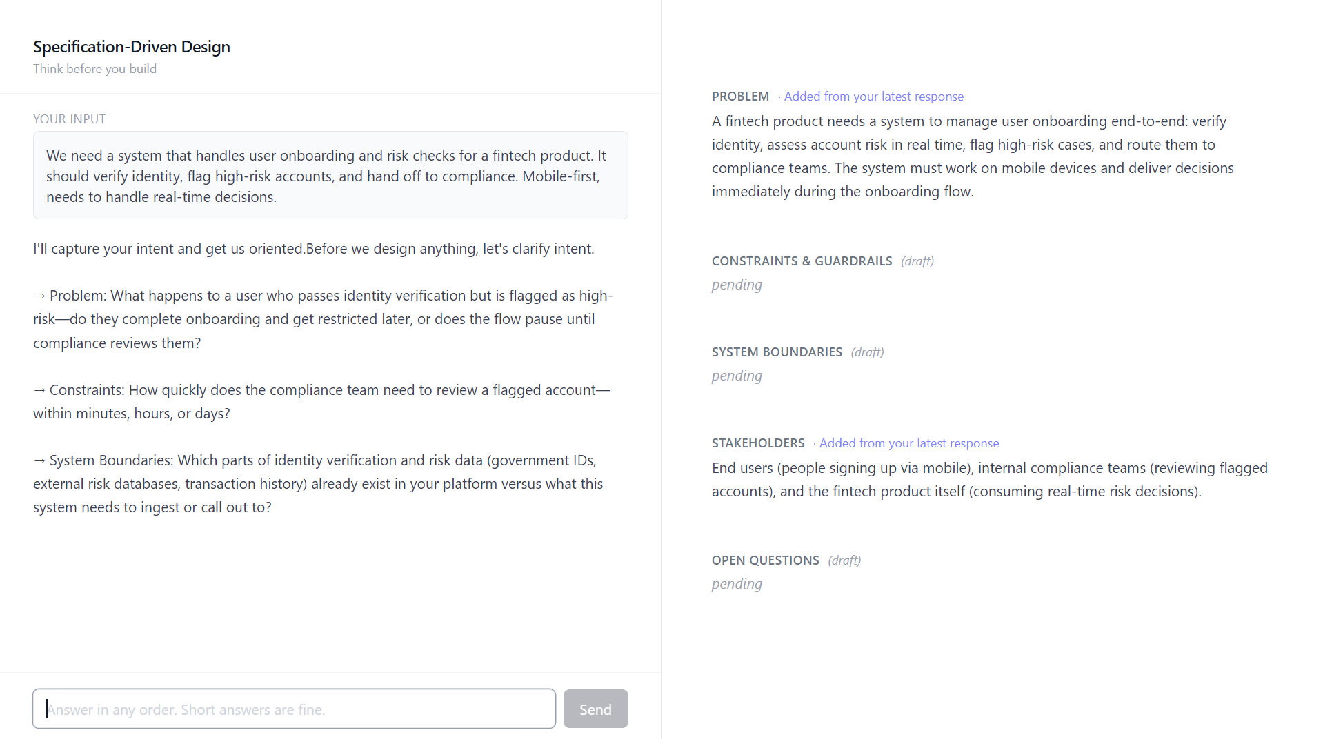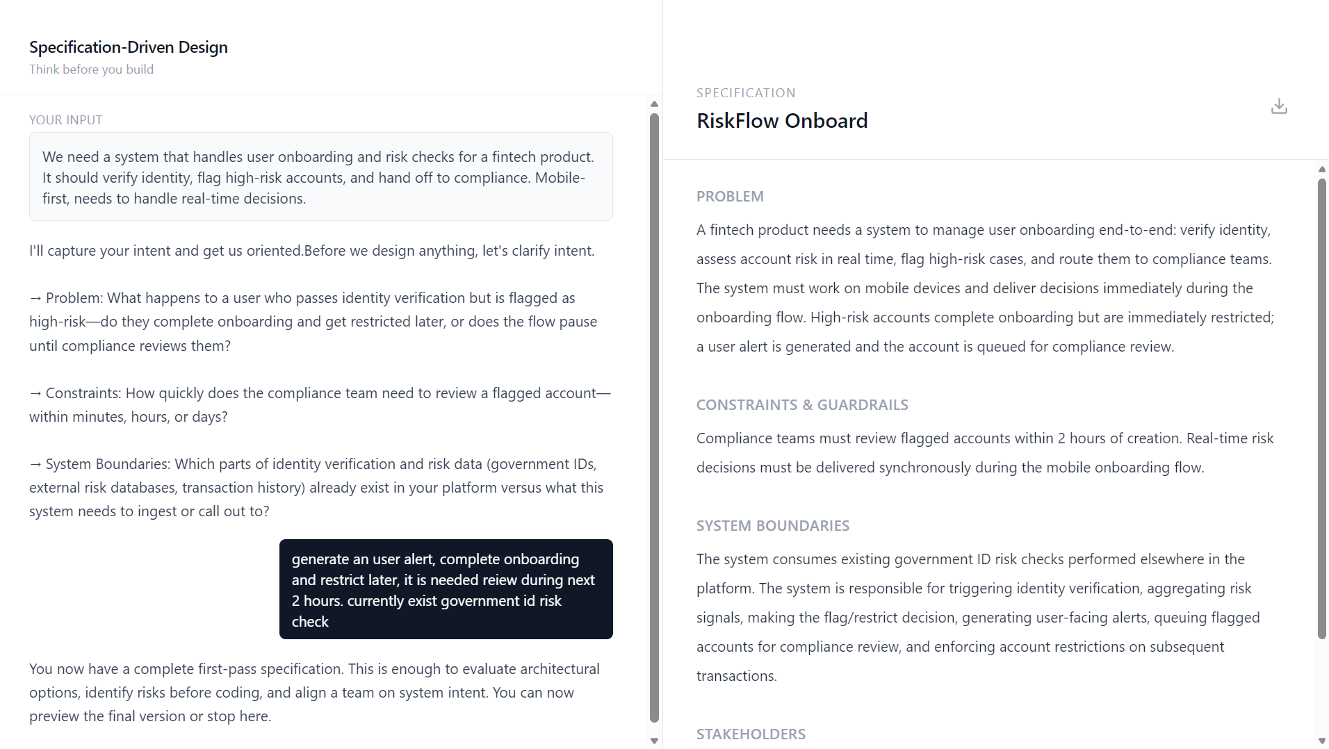 How it works: Type a rough system description into the left panel. SpecFirst's AI immediately paraphrases your intent, then asks exactly three clarifying questions — each tied to a named spec section (Problem,Constraints & Guardrails, System Boundaries). As you answer, the right panel fills in real time. When all three sections are populated, the loop exits naturally and you can preview the final specification as a clean Markdown document.