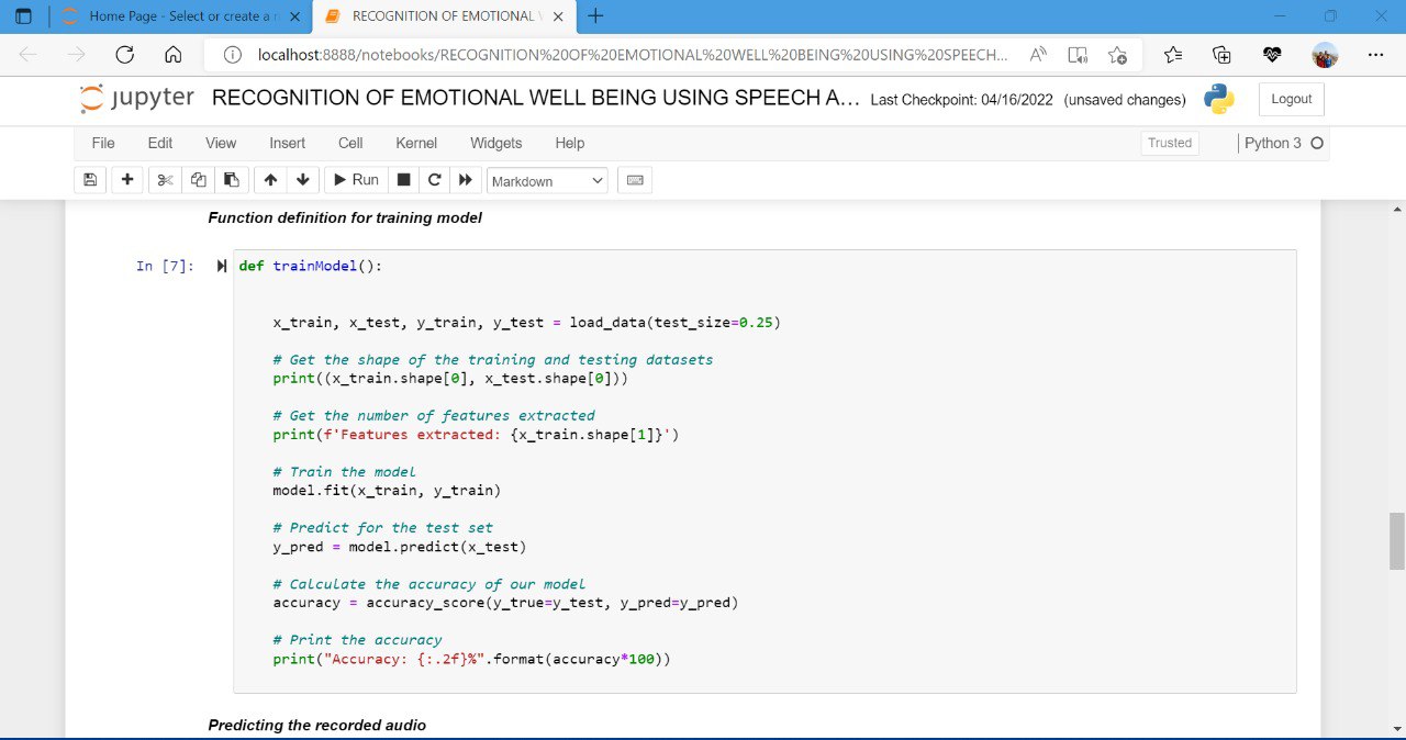At first loading the data from a folder which can be done using python library glob and getting base name using os library as we know RAVDEES dataset is made such a way that emotion on 2nd base so declaring X for feature and y for emotion. X is obtained from “extract_feature” and y obtained using “basename” after splitting the base name and we know the “basename” refers to what emotion from above int2emotion. Our next step had to make the emotion classifier i.e. model for that we used Multilayer perceptron classifier (MLP classifier)