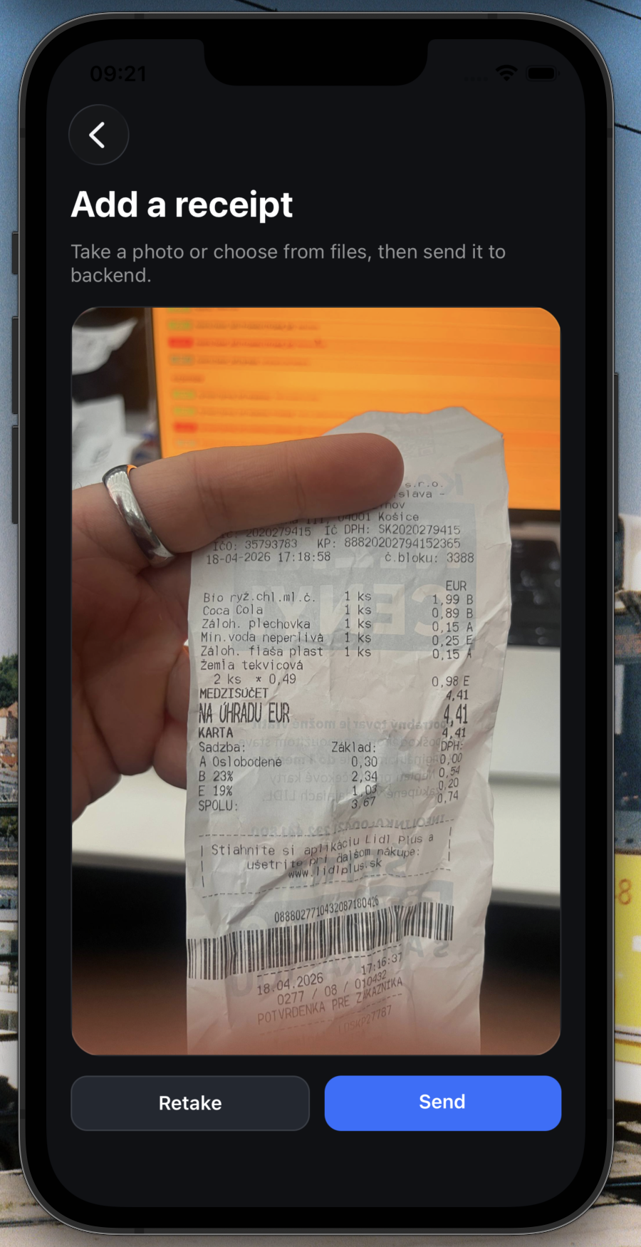 A python-based architecture underlying FastAPI, which is connected to MongoDB. A backend call processes the receipts using OCR, natural language interpretation, data extraction, and machine translation, by submitting a query to Mistral AI. The prototype uses limited free-tier tokens, but can be scaled up easily. The mobile app runs in React Native.