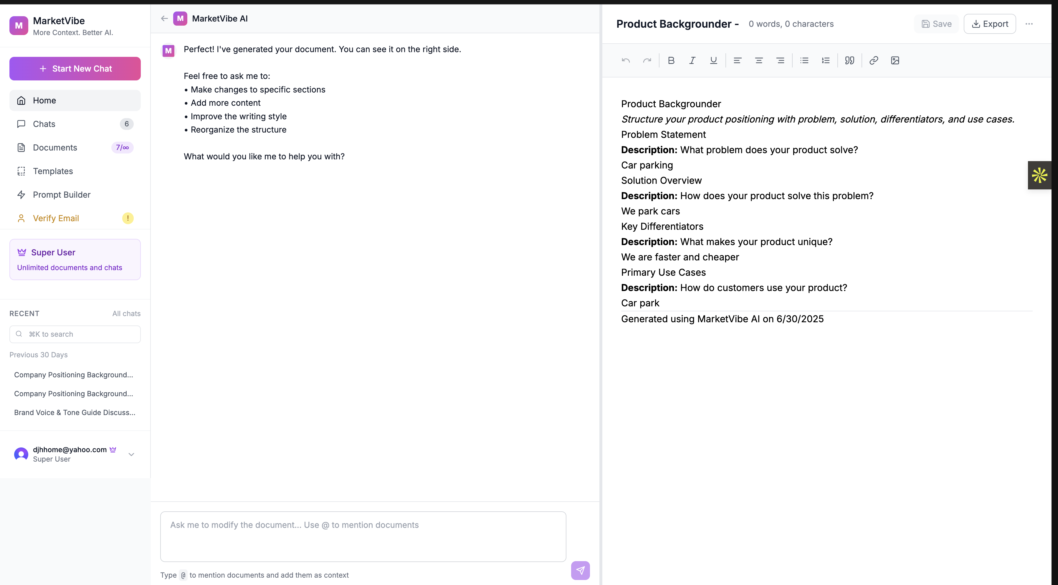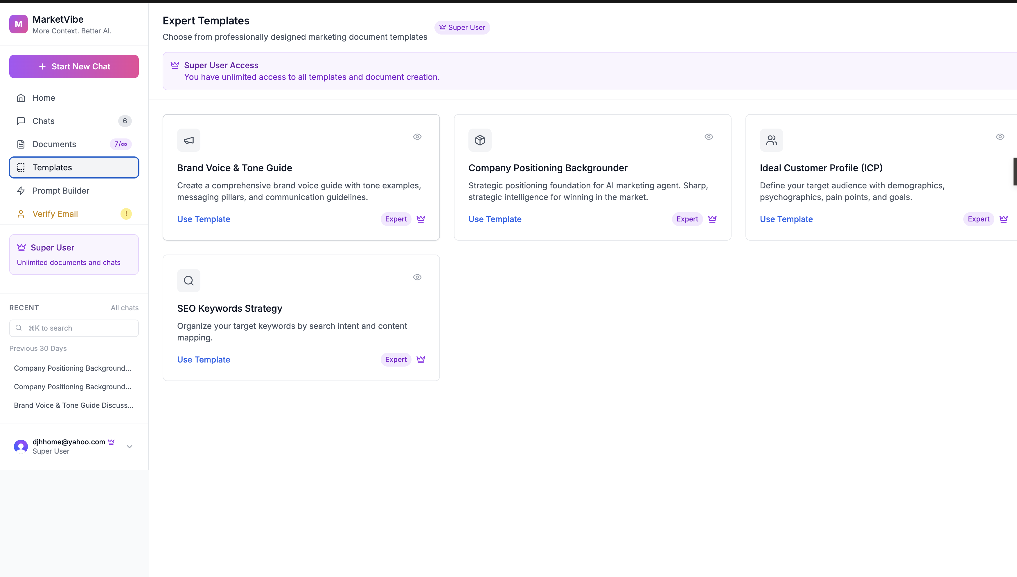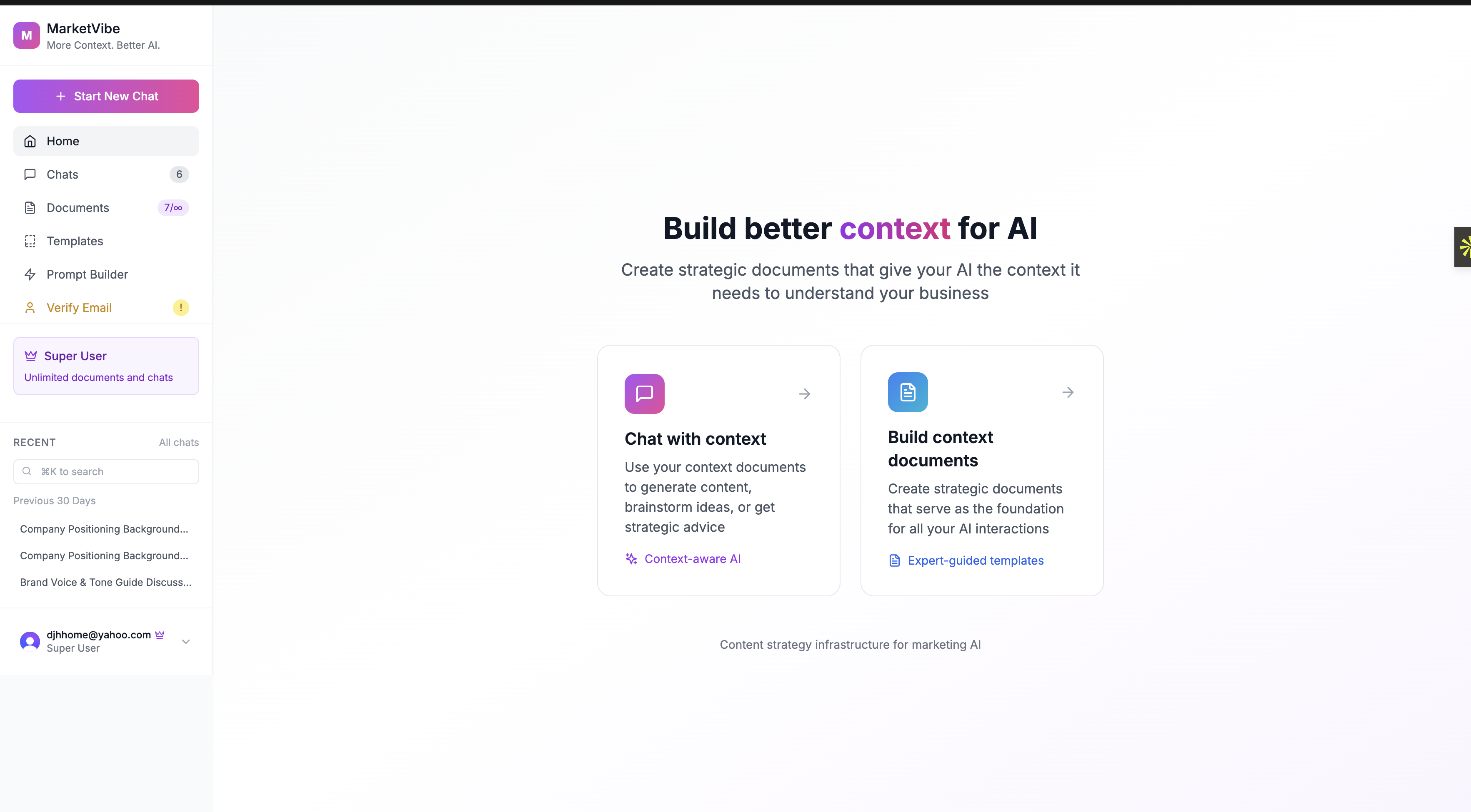 As a CMO who successfully 10x'd marketing performance using AI, I discovered that the secret sauce wasn't just the technology—it was context. The more precise and comprehensive context I could provide to AI systems, the better they performed. However, I quickly realized that building high-quality context documents and ensuring my entire team was aligned on the same strategic foundation was incredibly challenging. This disconnect between individual AI success and organizational alignment inspired MarketVibe.