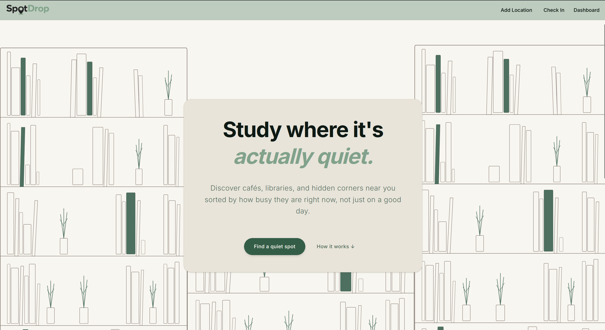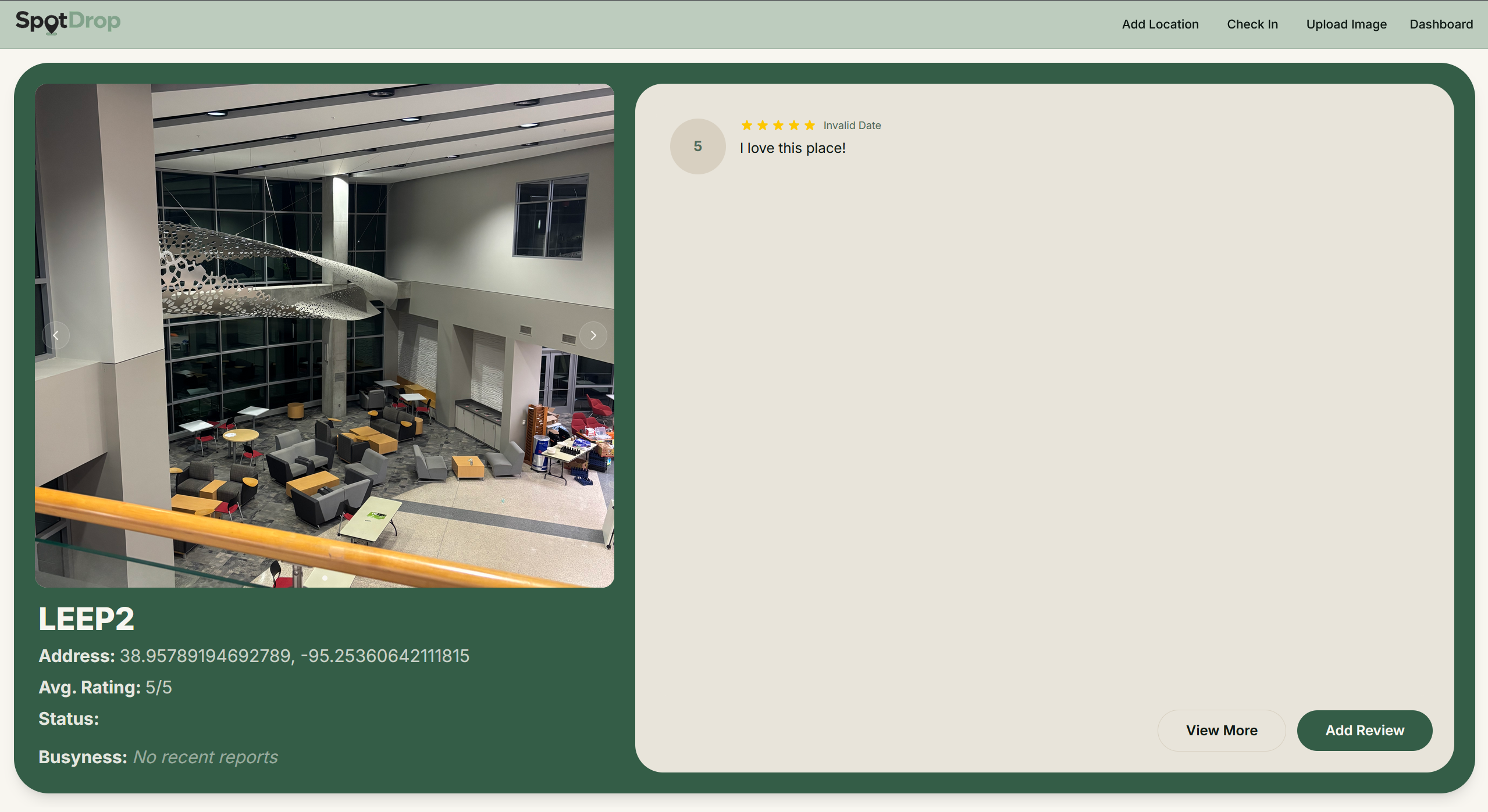 SpotDrop shows you study spots near you, how busy they are throughout the day, and community reviews and photos, so that you can find the perfect spot to study before you even leave.