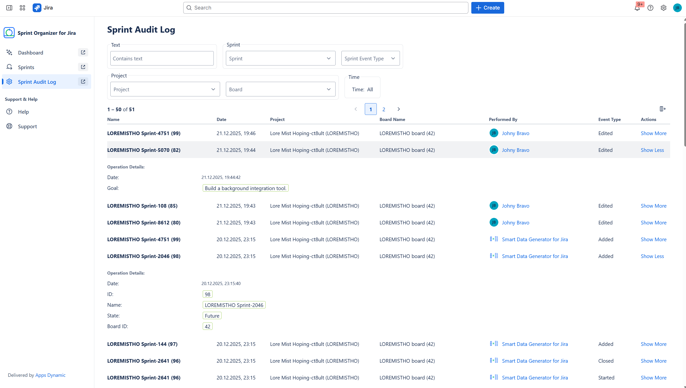 Full visibility into sprint history, including deleted sprints, allowing comprehensive visualization, auditing, and change tracking over time.
