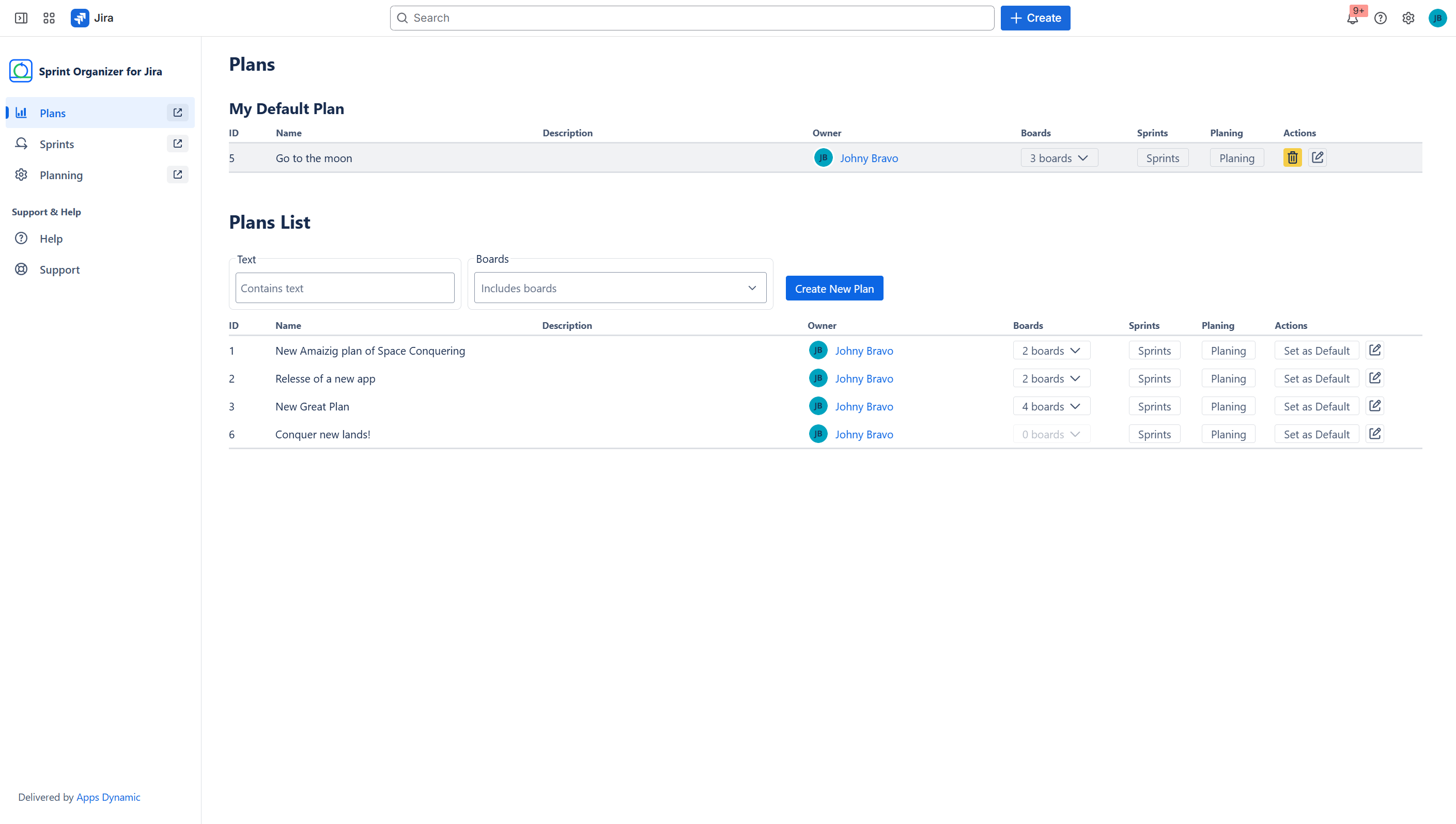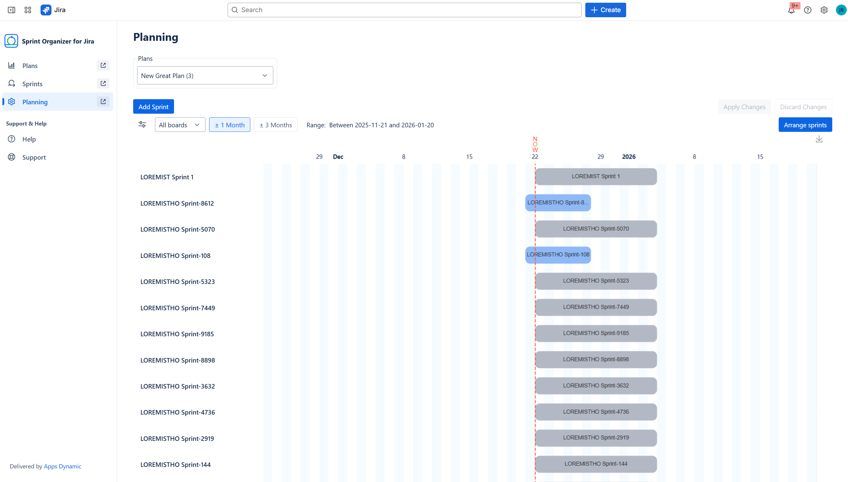 Sprint Organizer introduces Plans—containers that aggregate sprints from up to 20 boards. Plans allow teams to:
