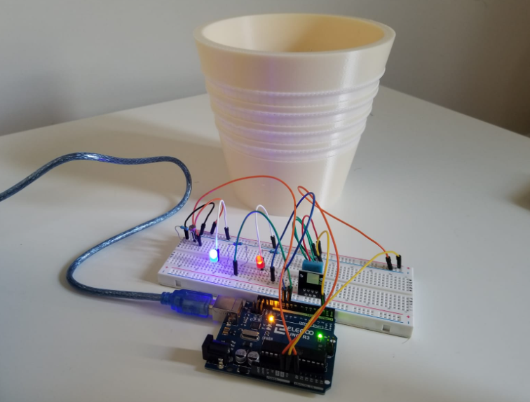 Sprout is a plant pot that provides visual feedback regarding the two main causes for plant death— light intensity and moisture level. This information is given through color changing LEDs. There are 2 distinct LED's- a red one, corresponding to light intensity, and a blue one, corresponding to moisture content. For our project, we used the DHT sensor to detect humidity as a replacement for a soil moisture sensor because we did not have this sensor. As the light intensity or humidity increases the LEDs increase in brightness. As the light and humidity decrease the LEDs dim. This gives the plant owner visual feedback on 2 vital metrics.