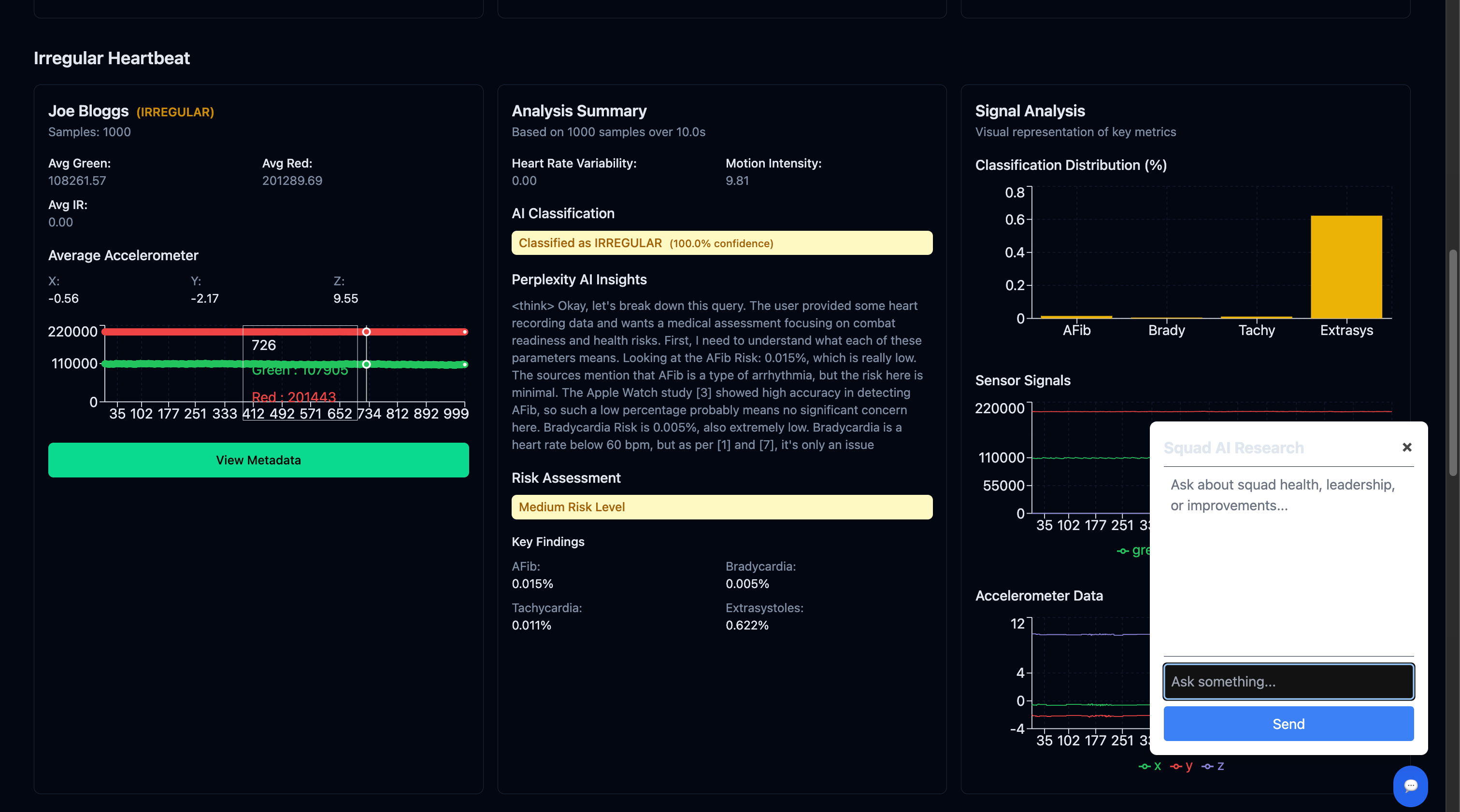 SquadPulse leverages advanced data analytics to classify each soldier’s cardiac signals into categories—regular, irregular, or AFib—based on photoplethysmography (PPG) data and broader metadata. We utilized deep learning models (trained in Python, PyTorch, TensorFlow, and Excel pivot-based data orchestration) to ensure the system and model pinpoints anomalies. Commanders can view squad-level health or deep-dive into individual soldier stats in real time.