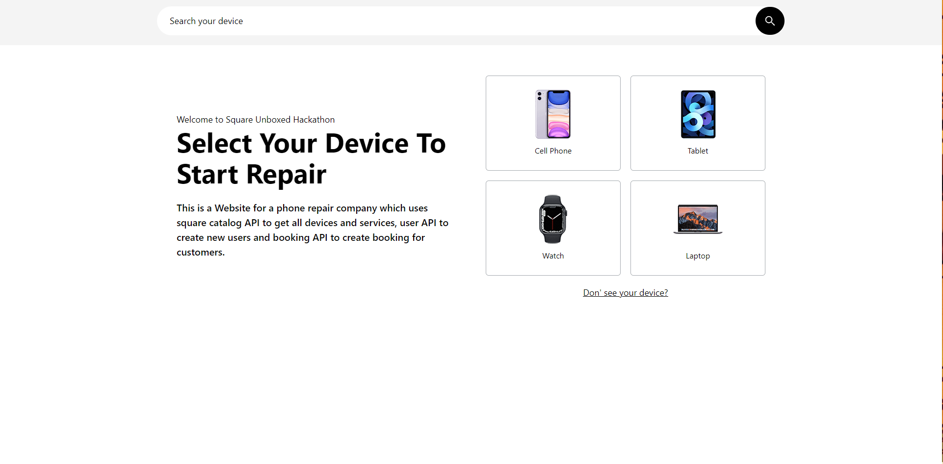 It is basically a website for an imaginary phone repair shop that is already using a square to manage its business. You can choose what phone you have -> select the problem -> pick a date for booking and get an appointment.