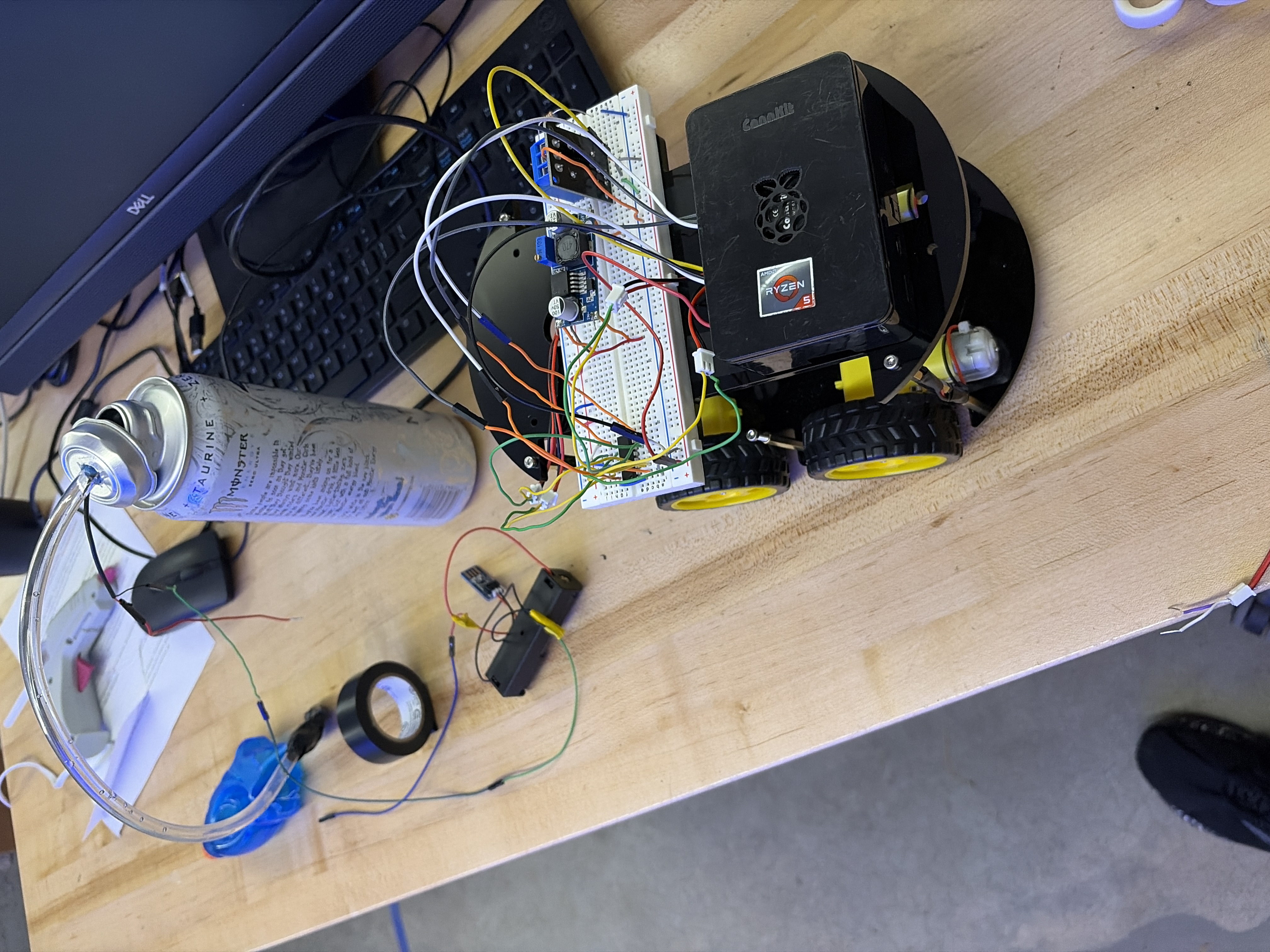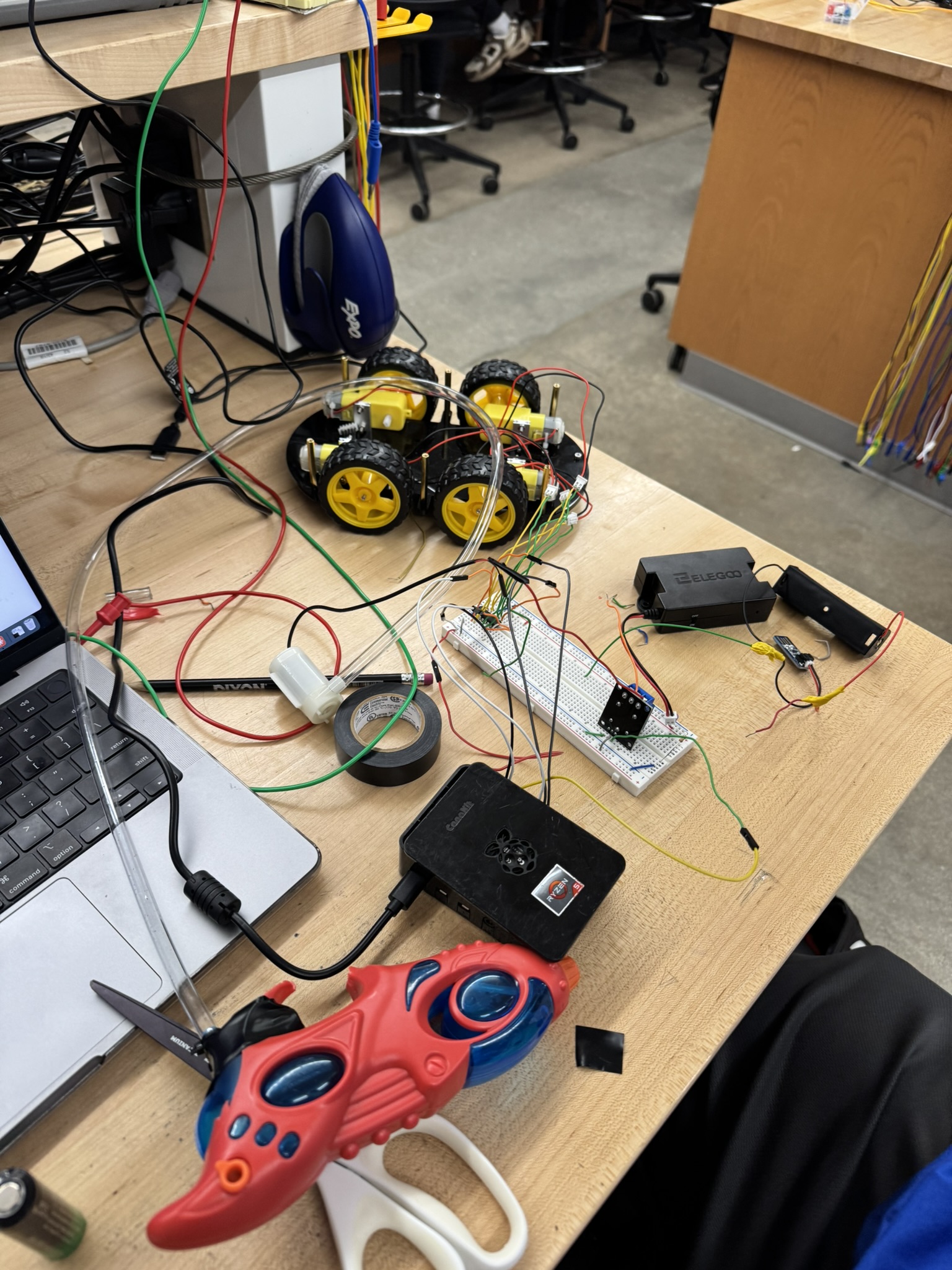 We took the frame of a elegoo smart car with wheels and dc motors. Then we attached a breadboard for the wiring and connected a Raspberry-pi to be Sqwerty's "brain". He runs servers to read inputs from our website and also runs a server to stream his camera view. Attached to him is a water reservoir made from a can of white sugar-free monster, and with vinyl tubing, fed water to a 5V pump that shoots water out the front of Sqwerty. Our website gives users access to control Sqwerty after submitting a token and gives everybody the ability to see what he is doing.