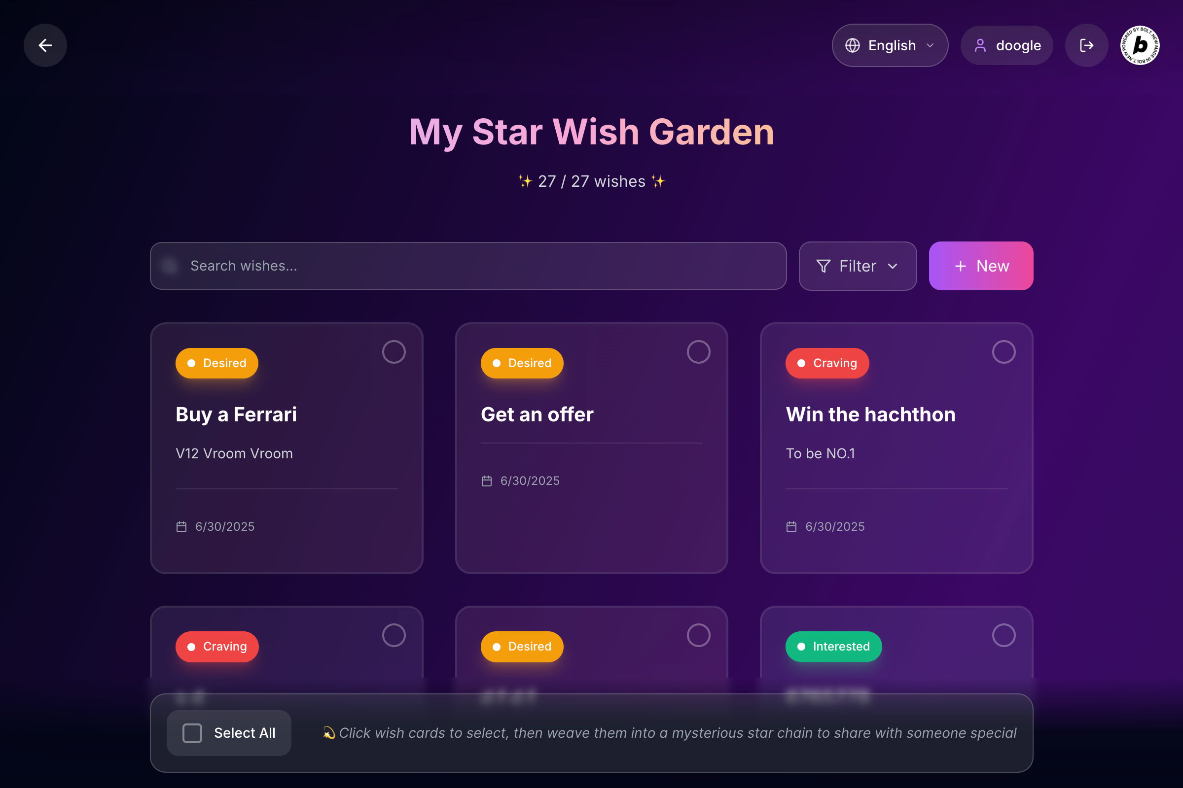 Starwish lets you turn your wishes into stars. You can then weave them into a “Star Chain” and send a secret link to someone special. When they open the link, they'll randomly draw one wish from your wish box—just once. What they receive remains a surprise for you, so they can secretly plan to make it happen. All wishes remain private and can only be opened a single time.