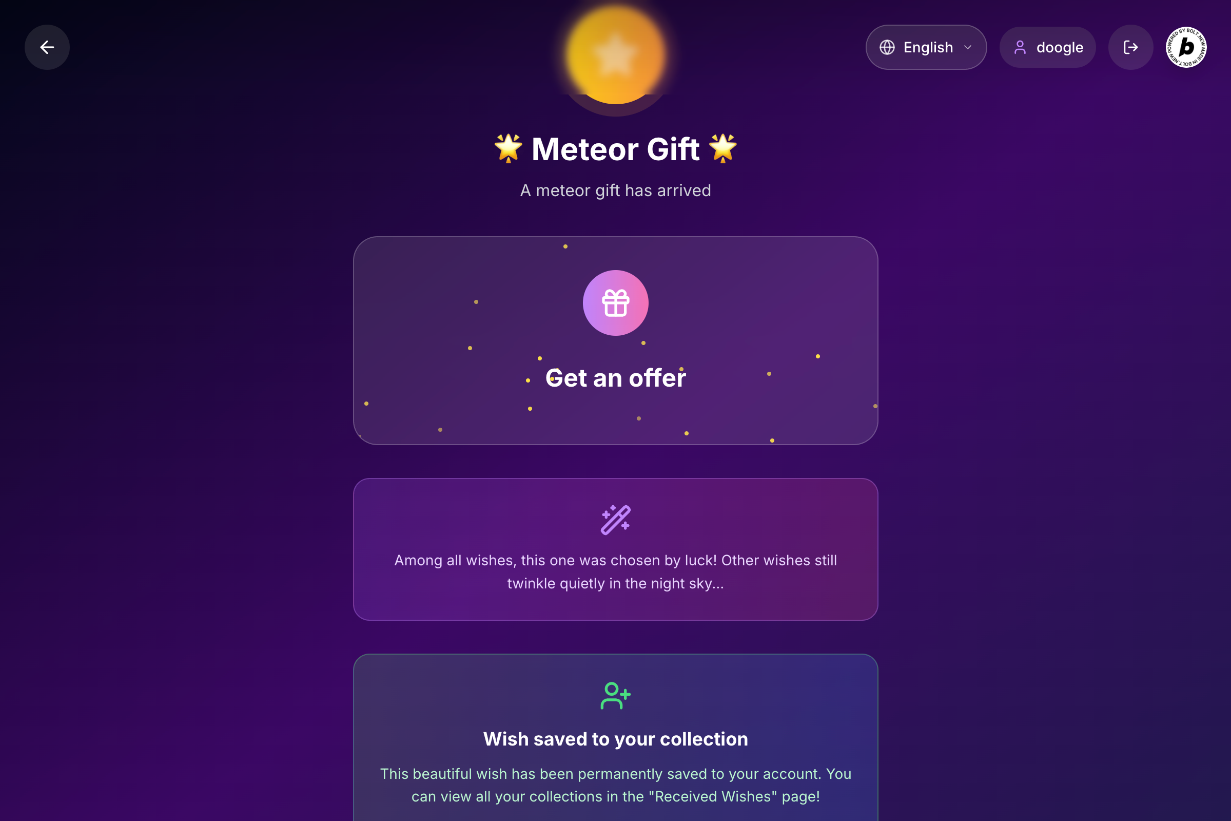 We’ve all wished upon a star, hoping our dreams would come true. Now with Starwish, your wishes become stars—ones your friends can help make real. Each wish is a mystery: your friend draws one at random from a bundle, and even you won’t know which one they picked.