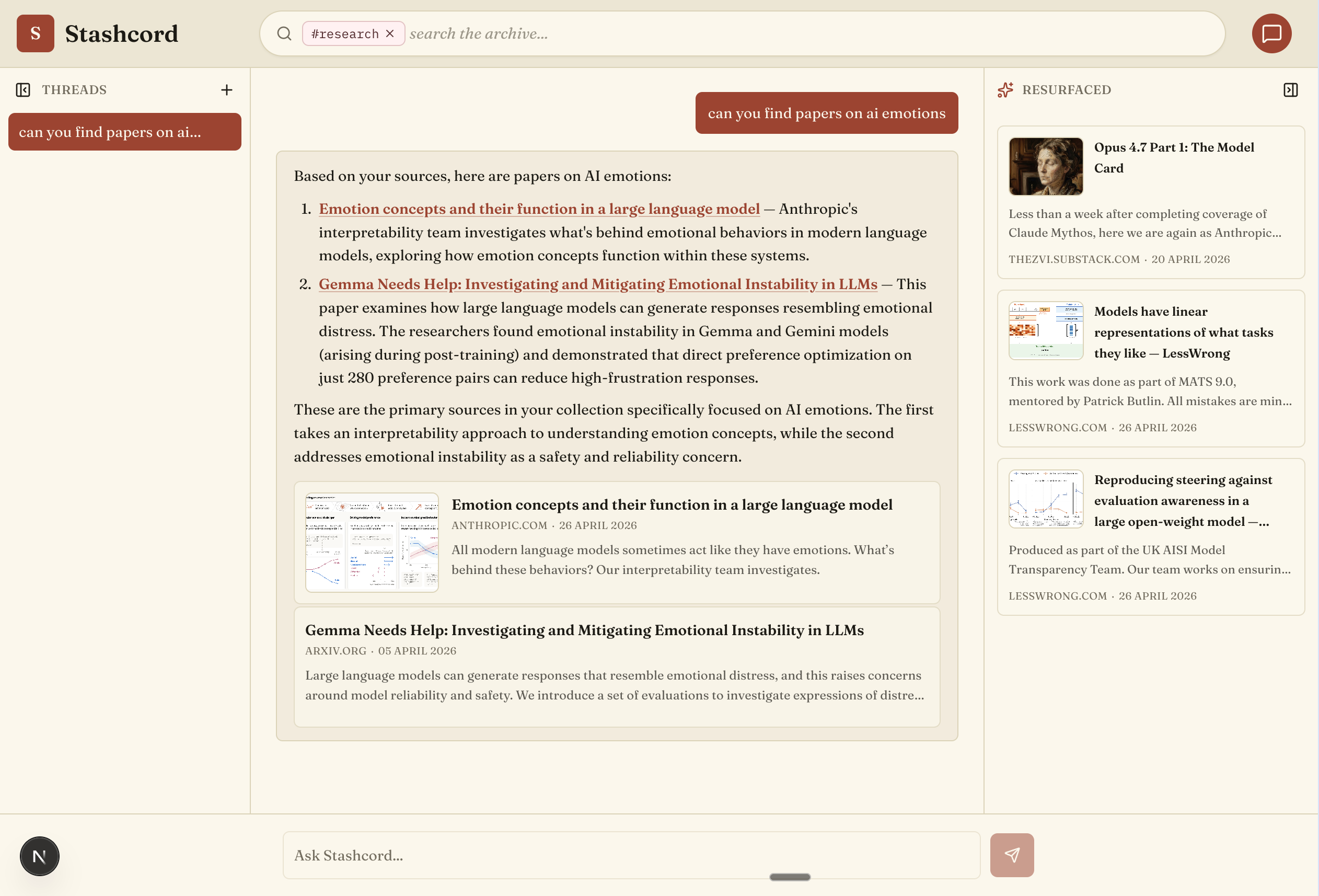 Stashcord also helps researchers and creatives with the Resurface feature. While discussing an issue with Claude, Stashcord will automatically suggest related entries that you might have forgotten you even saved! This might be a study that was unexpectedly relevant, or a cool quote that perfectly fits what you've been trying to write.