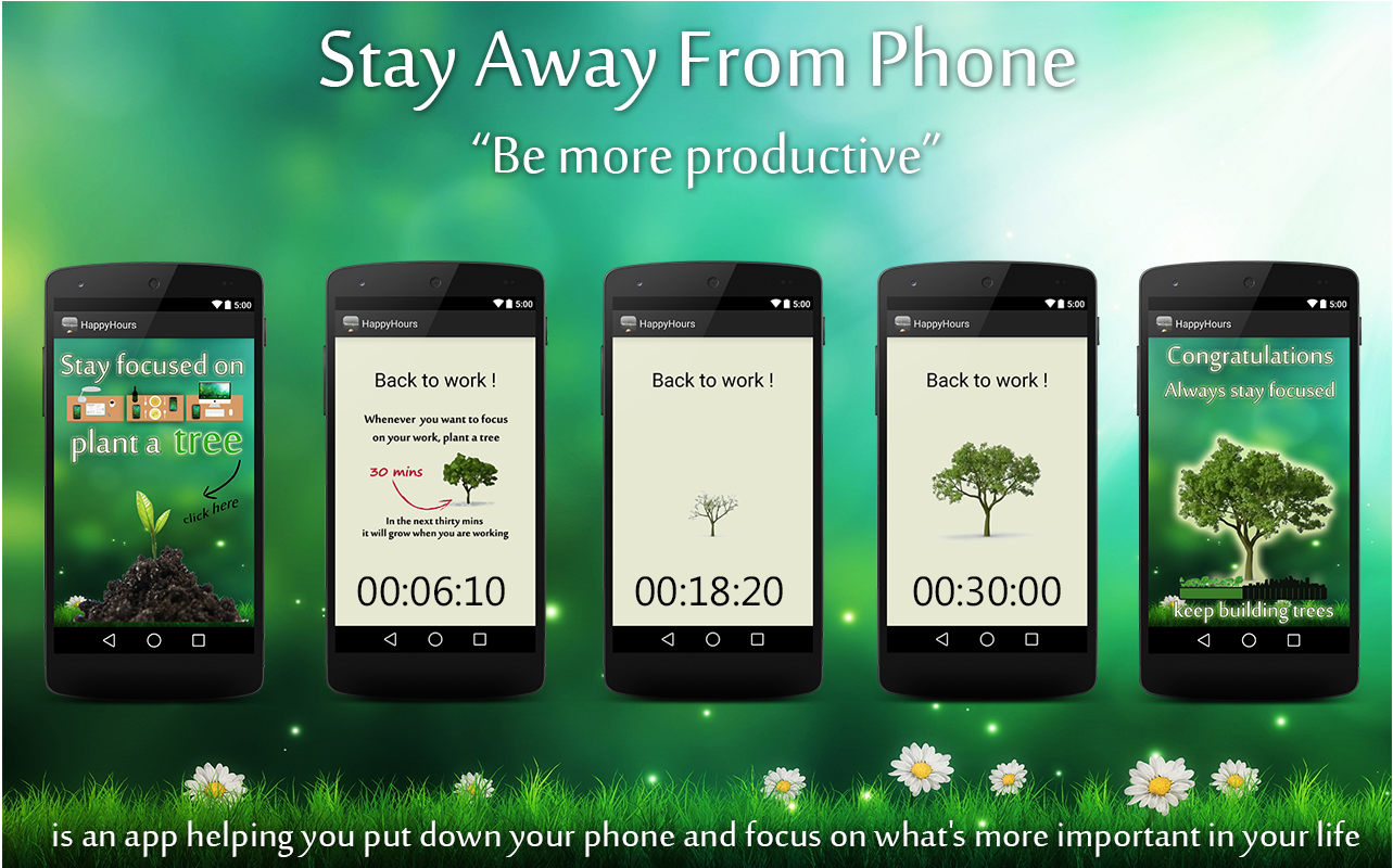 "Stay Away From Phone" is an application helping you stay away from your smartphone and stay focused on your work. Whenever you want to concentrate, you can plant a small seed. In the next 30 minutes, this seed will gradually grow into a big tree. However, if you cannot resist the temptation and leave this app to check Facebook or play a game, your little tree will wither away. Every day you will own a forest filled with trees and every tree represents 30-MINUTES of work, of concentration, of productivity, that you have been working hard. Features • A self-motivated and interesting method to help you beat phone addiction • Cultivate your personal pattern of time management: make good use of 30-minutes to fully concentrate on your work and finish it effectively • You can track your tree right on your Smartwatch Android Wear • Imrove your self productivity at work, at school or at home :)