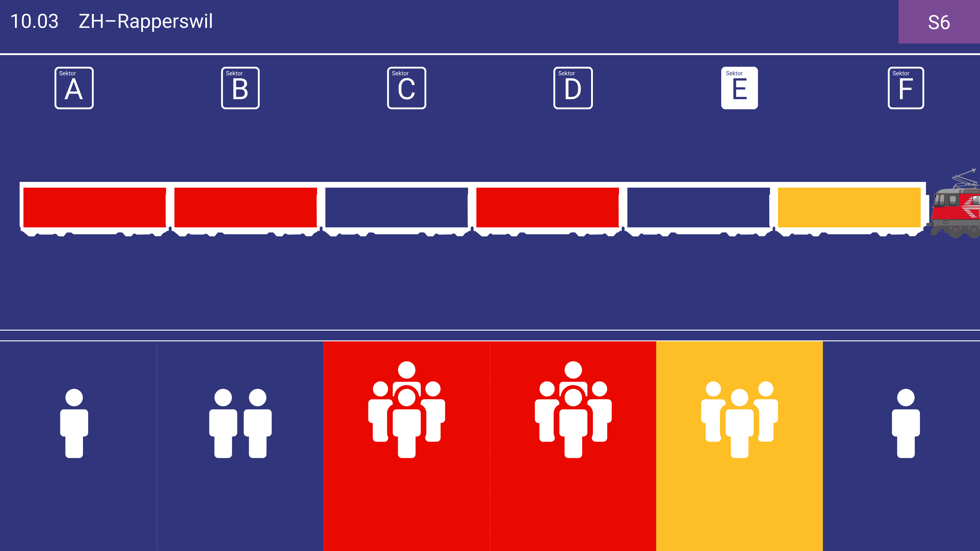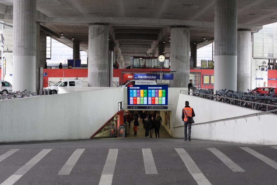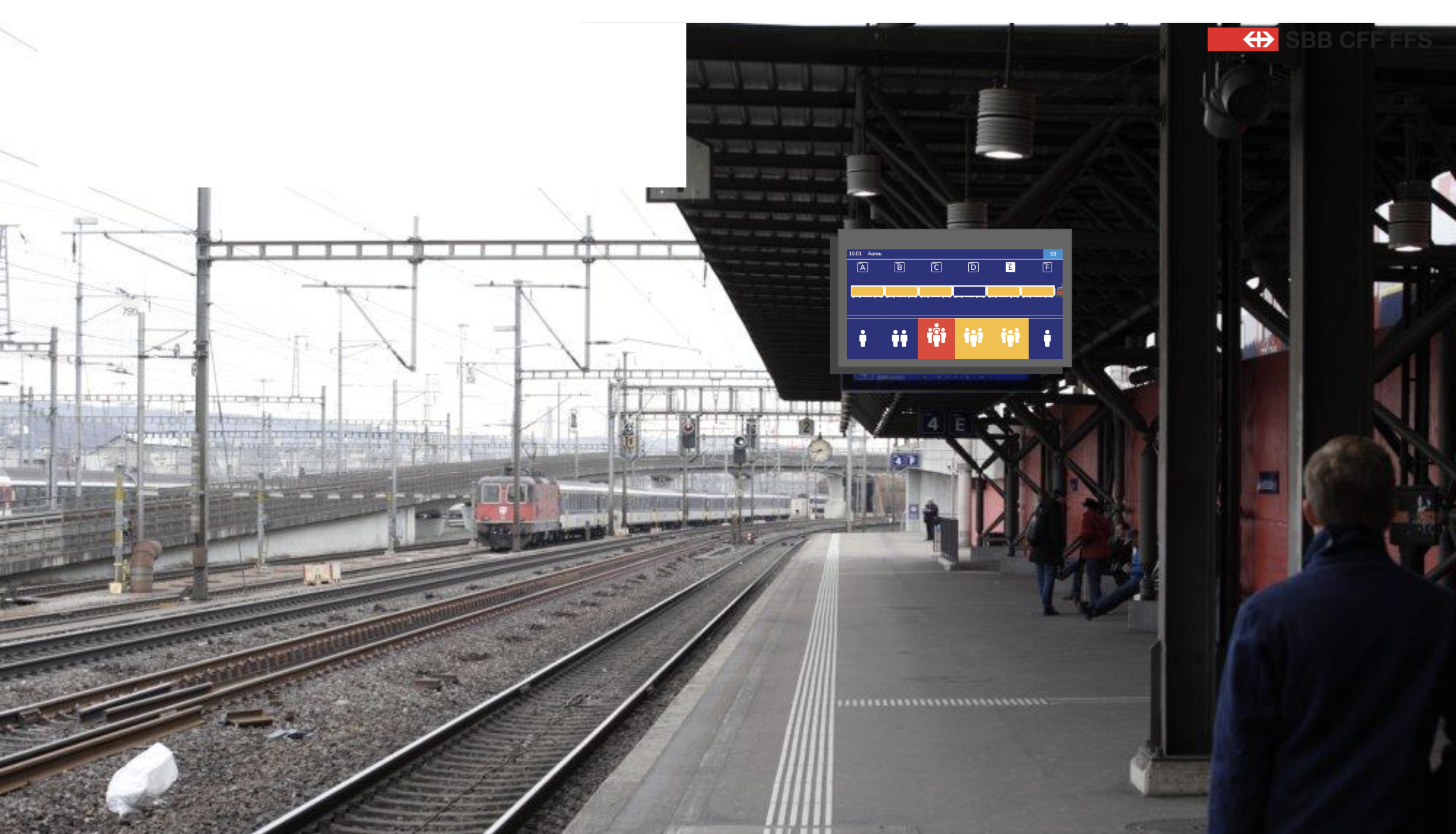 Platforms 2 and 3 at Zürich Hardbrücke station become very congested at busy times. Passengers tend to crowd towards the middle of the platform. Our solution takes real time data from the station to work out which areas of the station are congested or less busy. This information is then used to direct passengers to the less busy sections of the platform. The primary way of doing this is through a new set of electronic station information boards, located at station entrances. Each board displays all of the services to stop at the station, when the train is due and, most importantly, the area of the platform they should go to for their train. The system works by directing the passenger to less crowded areas on the platform; this helps to even out the number of people in each area of the platform as the system adjusts dynamically to send people to less occupied locations. The system decides which platform area to send people to through the following process: