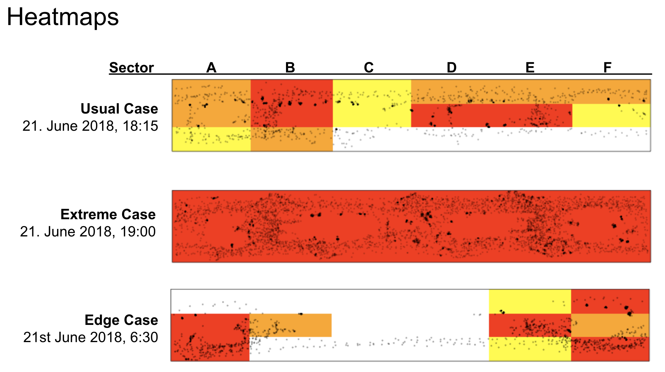 Heatmaps were generated by iterating in a moving-window though the 1.1GB dataset and exported minute-wise snapshots. To keep the heatmap snapshots comparable, they share the same kernel density calibration.