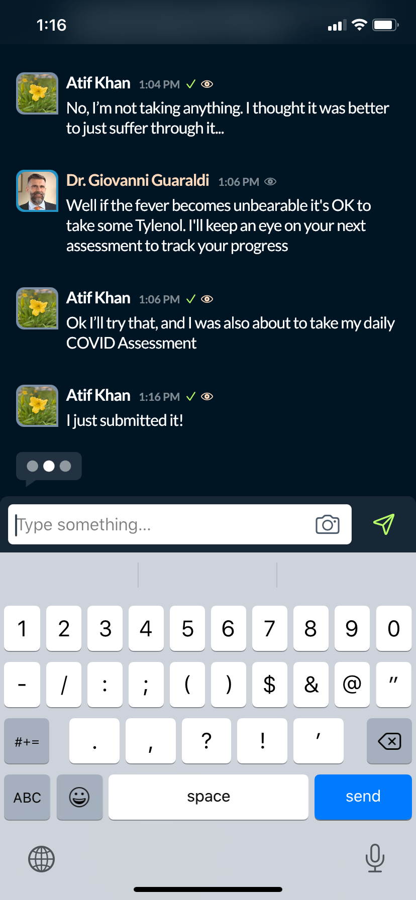 One-on-one video conferencing is not scalable in a pandemic, but doctor-patient communication is still vital. That's why we build in real-time chat into our app. Patients can still communicate important updates and changes to their conditions including uploading images or videos of something they are experiencing. The doctor dashboard makes messaging hundreds of patients fast and simple. In one hour a doctor can easily communicate with hundreds of patients instead of just one. Based on the Smart Assessment scoring a doctor can easily focus on the most critical patients first.