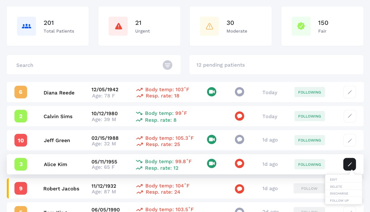 Our doctor dashboard makes virtually monitoring and triaging large numbers of patients possible