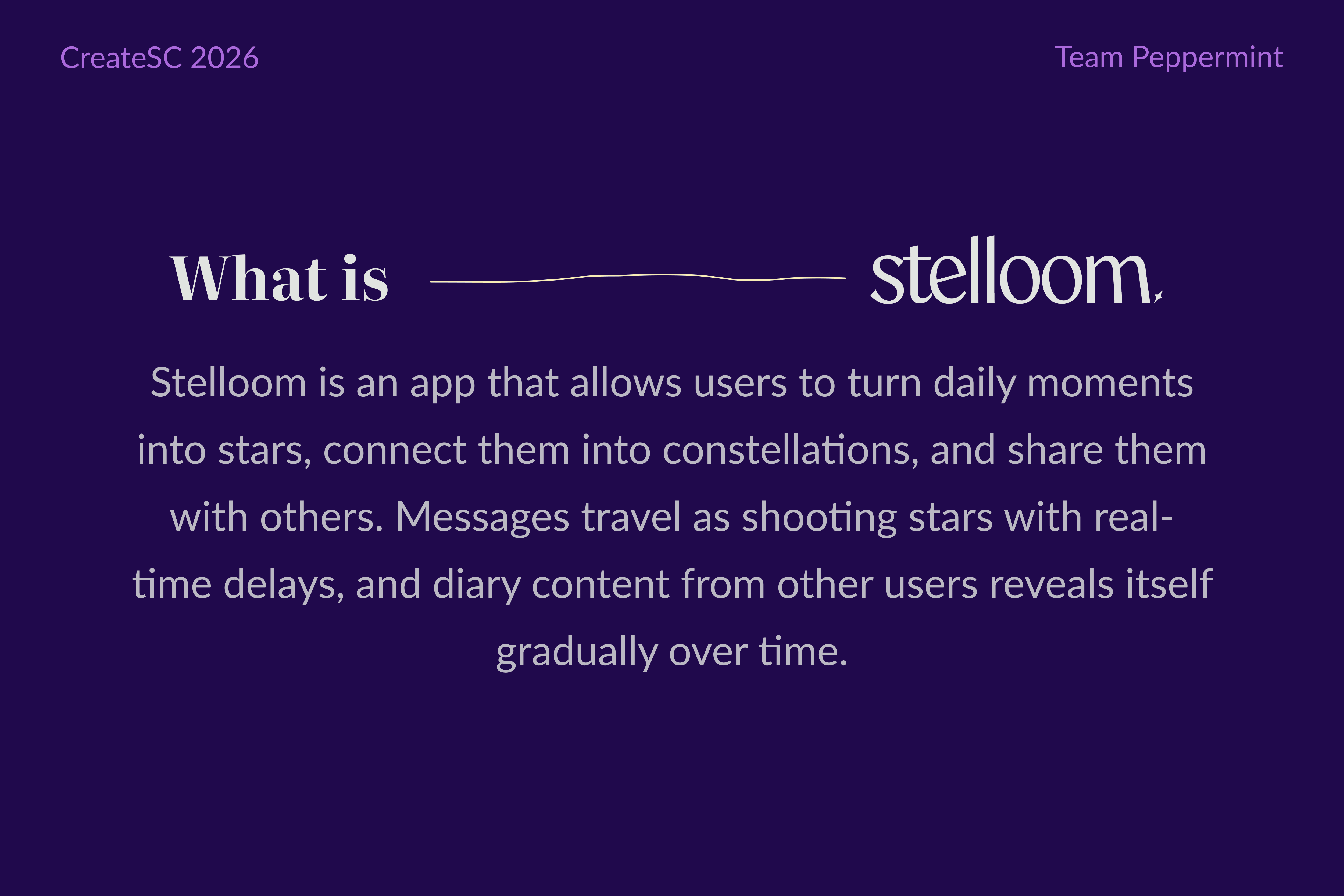 Stelloom is an evolving journaling experience where users turn daily moments into stars, connect them into constellations, and share them with others. Messages travel as shooting stars with real-time delays, and diary content from other users reveals itself gradually over time. The interface transforms with use, as stars and constellations are continuously added and gradually disappear over time. The app creates a personal night sky where memories, interactions, and stories gain meaning over time through anticipation and visual evolution. Overall, Stelloom focuses on bringing an intentional pause and reflective meaning back to the small moments we tend to capture and forget nowadays.