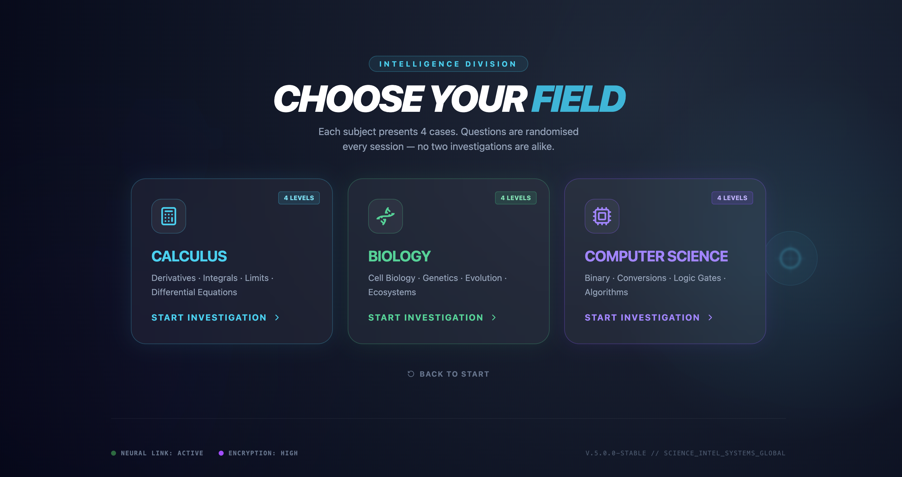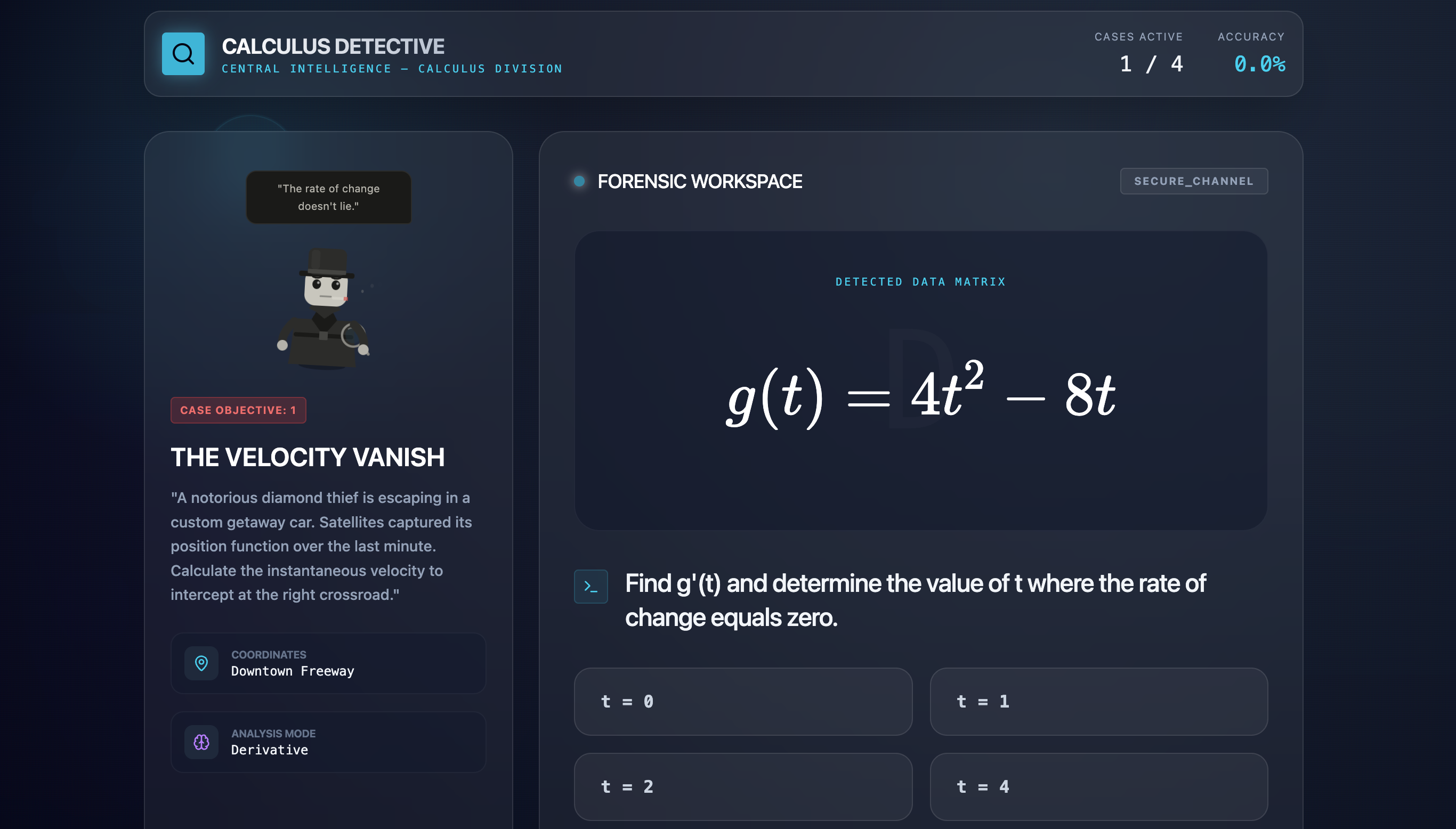 Players enter a detective world where each case can only be solved through science, math, or logic. Every investigation presents an academic question wrapped in a narrative scenario. Players might calculate a derivative to intercept a getaway car, identify a biology concept to analyze lab evidence, or solve a computer science logic problem to stop a rogue algorithm.