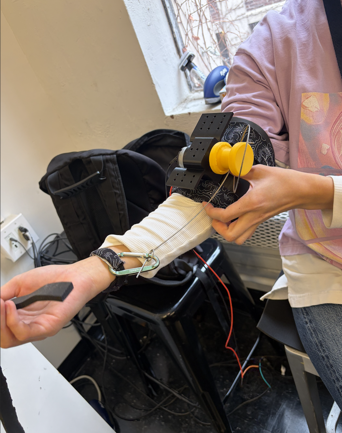 We mixed several fabrication methods to create our project. We have a few components: we have a frame for a shoe that pushes down a spring, a gearbox that contains electronics and gears that convert the spring energy into electrical energy, and a few mounts on the arm that hold our pulley system. The frame was made using a mix of foam and wood; the gearbox was 3D printed, and our arm mounts were sewed for a more comfortable fit.