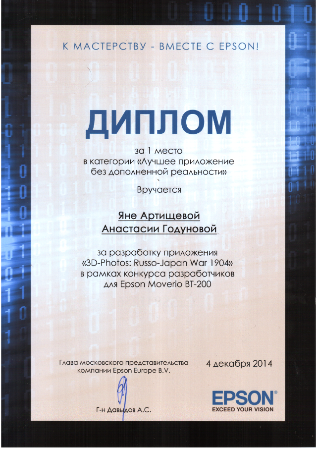 We won at Epson Moverio application contest in 11/2014 as best app without AR.
