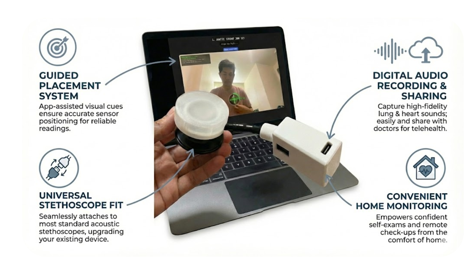 Latency was a big issue. A voice assistant feels broken if there is a long delay. We had to optimize our backend proxy to keep the voice response time under one second. Making the 3D-printed case fit securely onto different stethoscope brands also took many test prints.