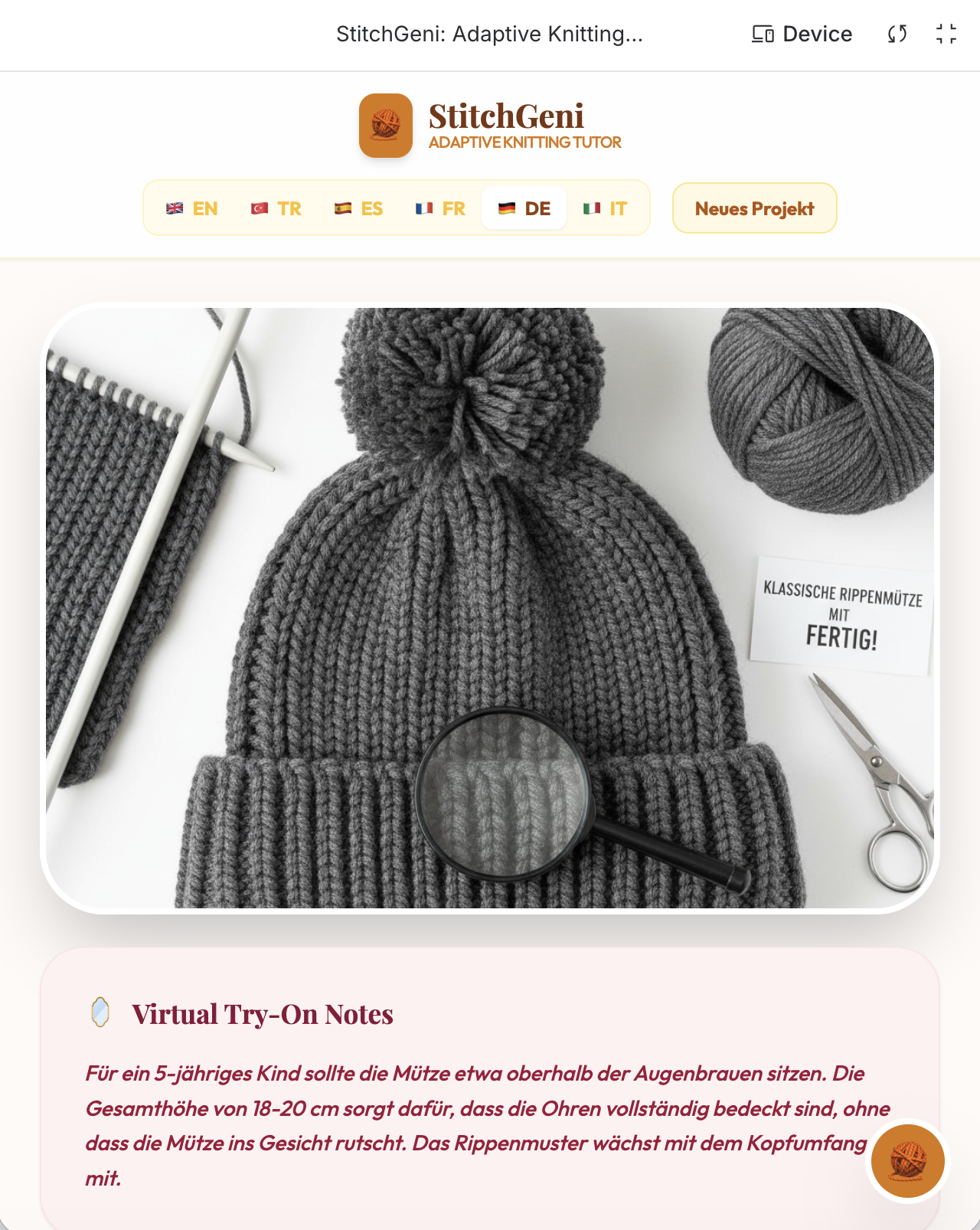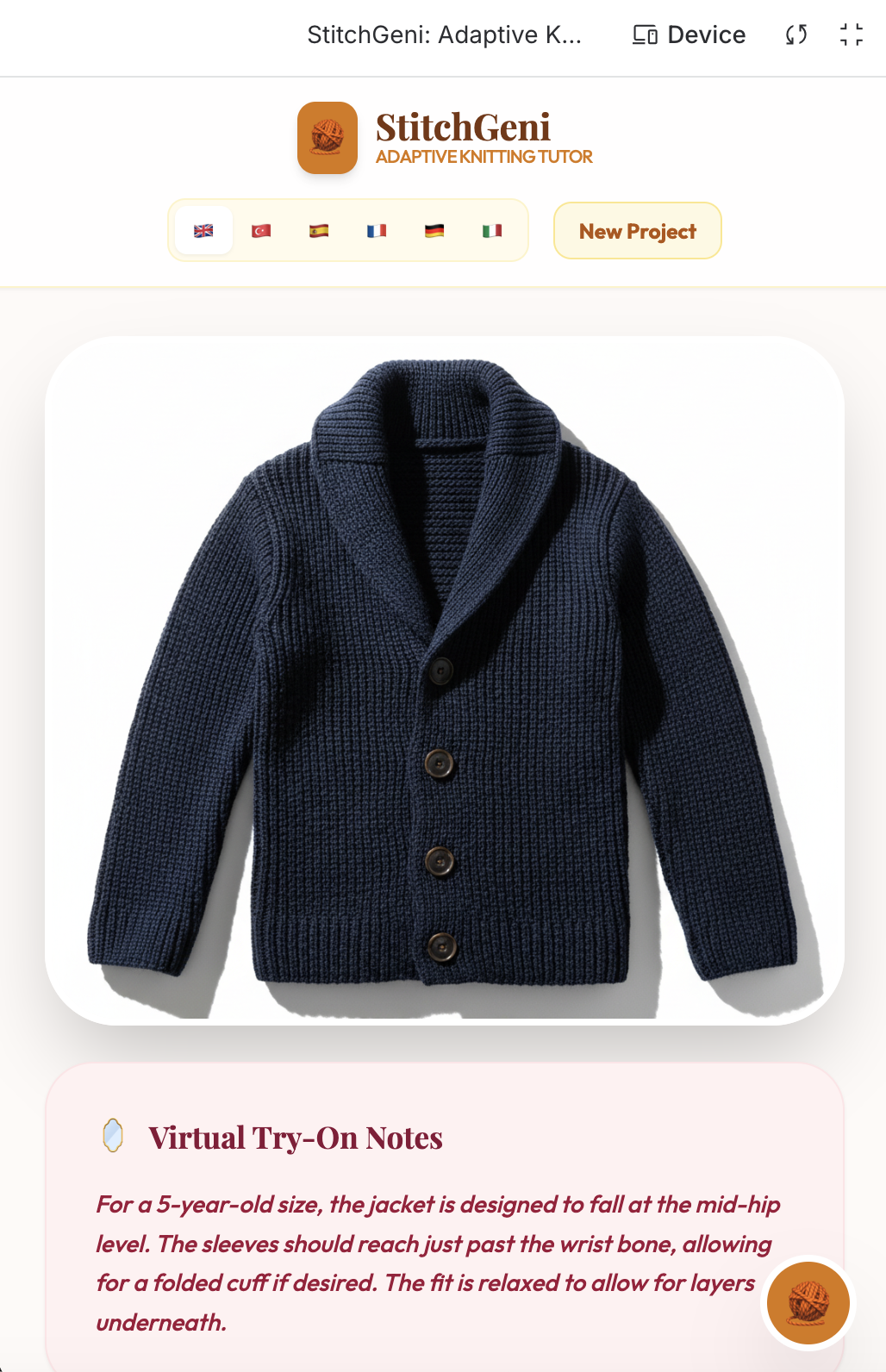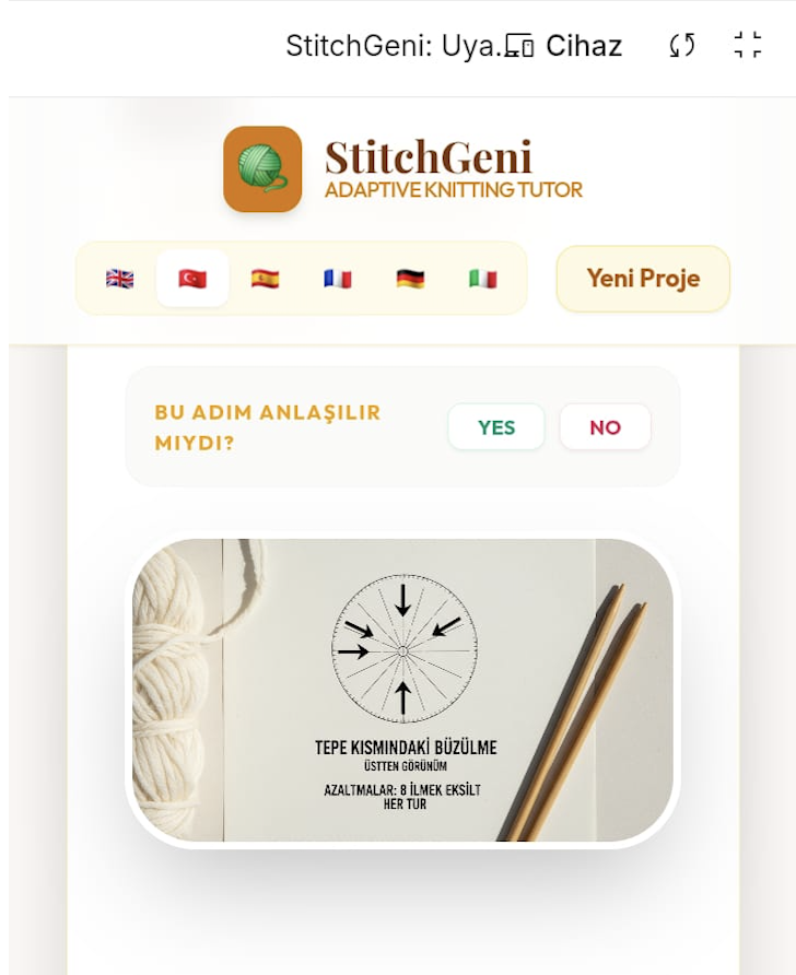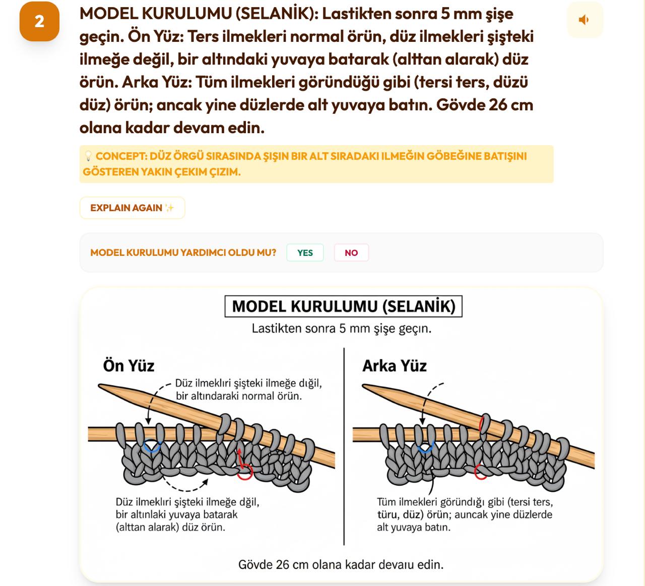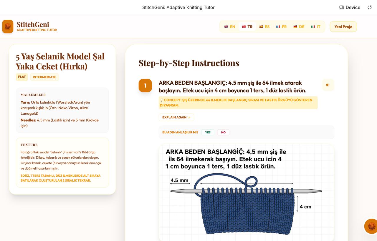 Instead of forcing users to interpret unclear diagrams or shorthand, StitchGeni aims to translate visual knitting knowledge into clear, spoken, step-by-step guidance, aligned with visuals that truly match each instruction.
