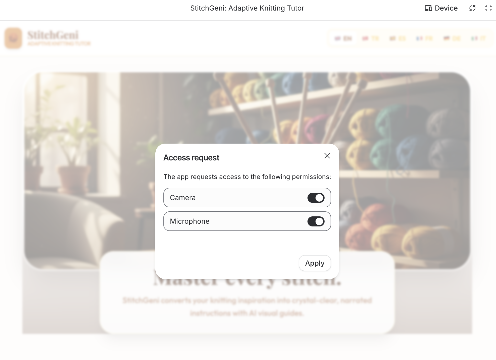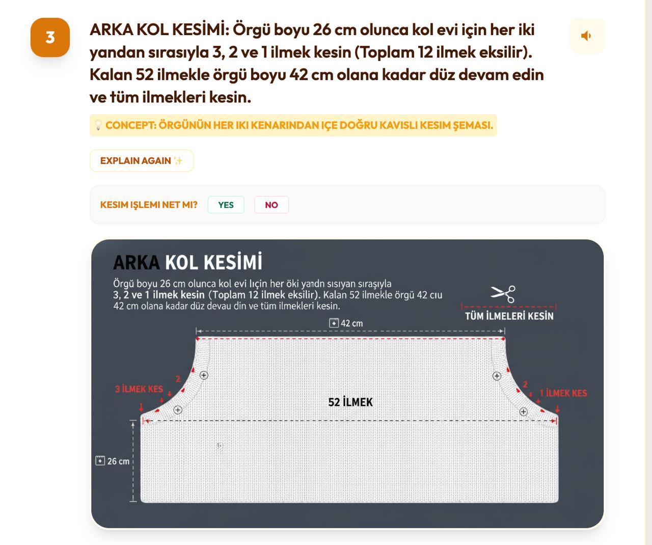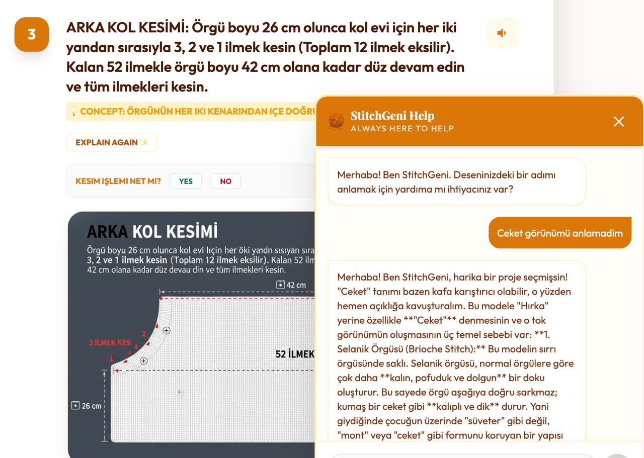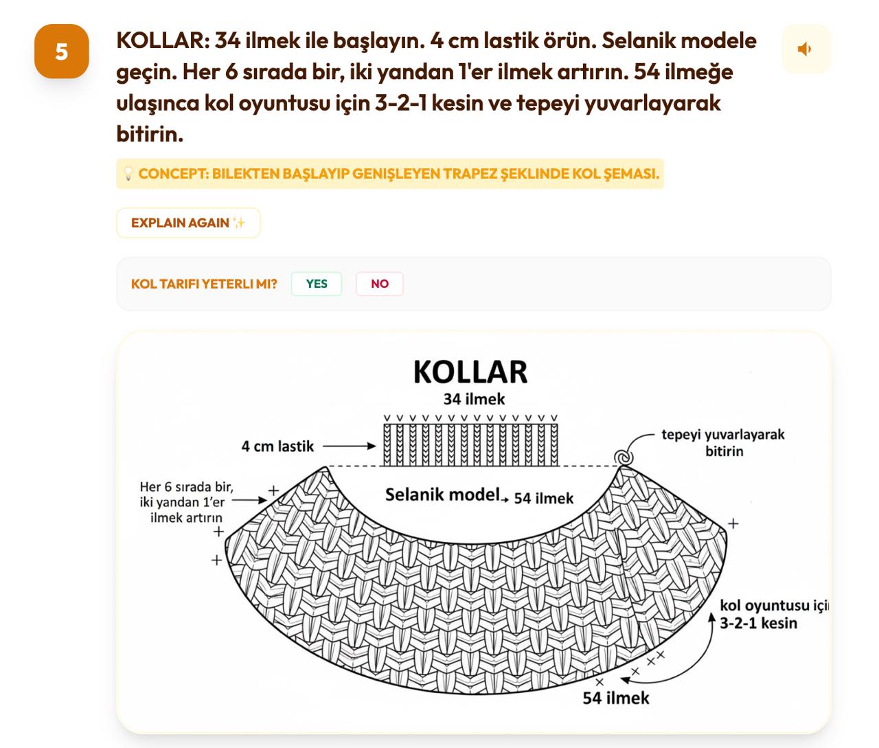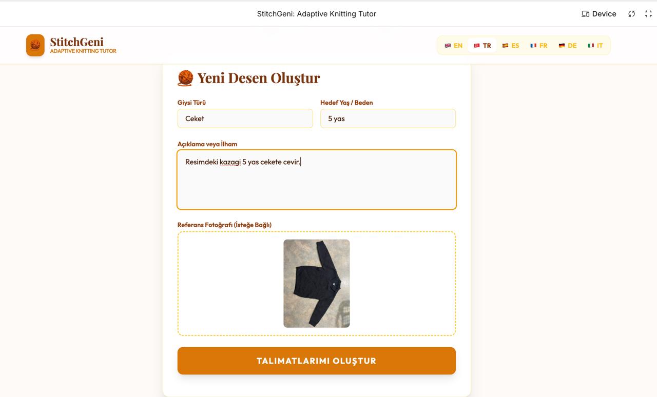Instead of forcing users to interpret unclear diagrams or shorthand, StitchGeni aims to translate visual knitting knowledge into clear, spoken, step-by-step guidance, aligned with visuals that truly match each instruction.