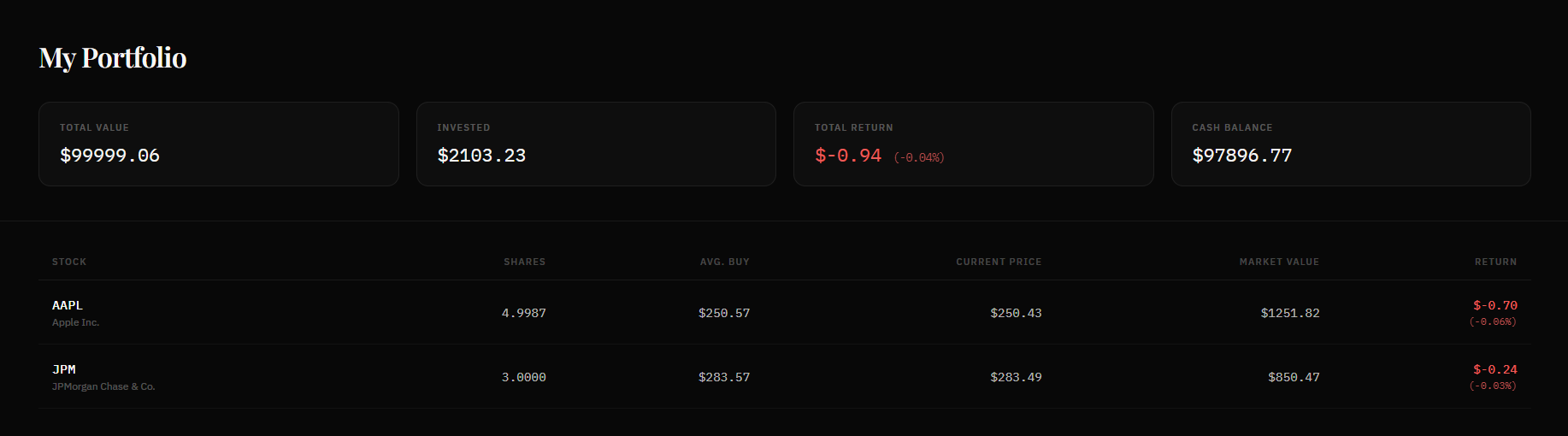 Each user receives a virtual dollar balance and can trade all 9 supported stocks without risking real capital. All prices come from Alpaca Markets and reflect real market data.
