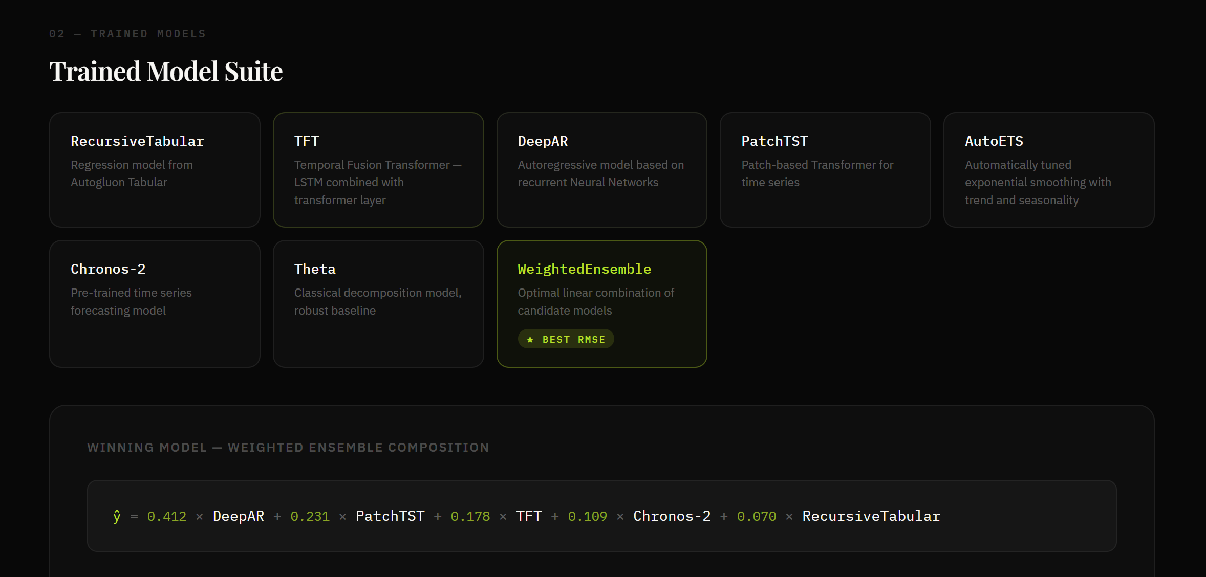 The best-performing model was a weighted ensemble of DeepAR, PatchTST, TFT, Chronos2, and Recursive Tabular models from AutoGluon. As AutoGluon time series models generate probabilistic predictions, we evaluated them on two levels:
