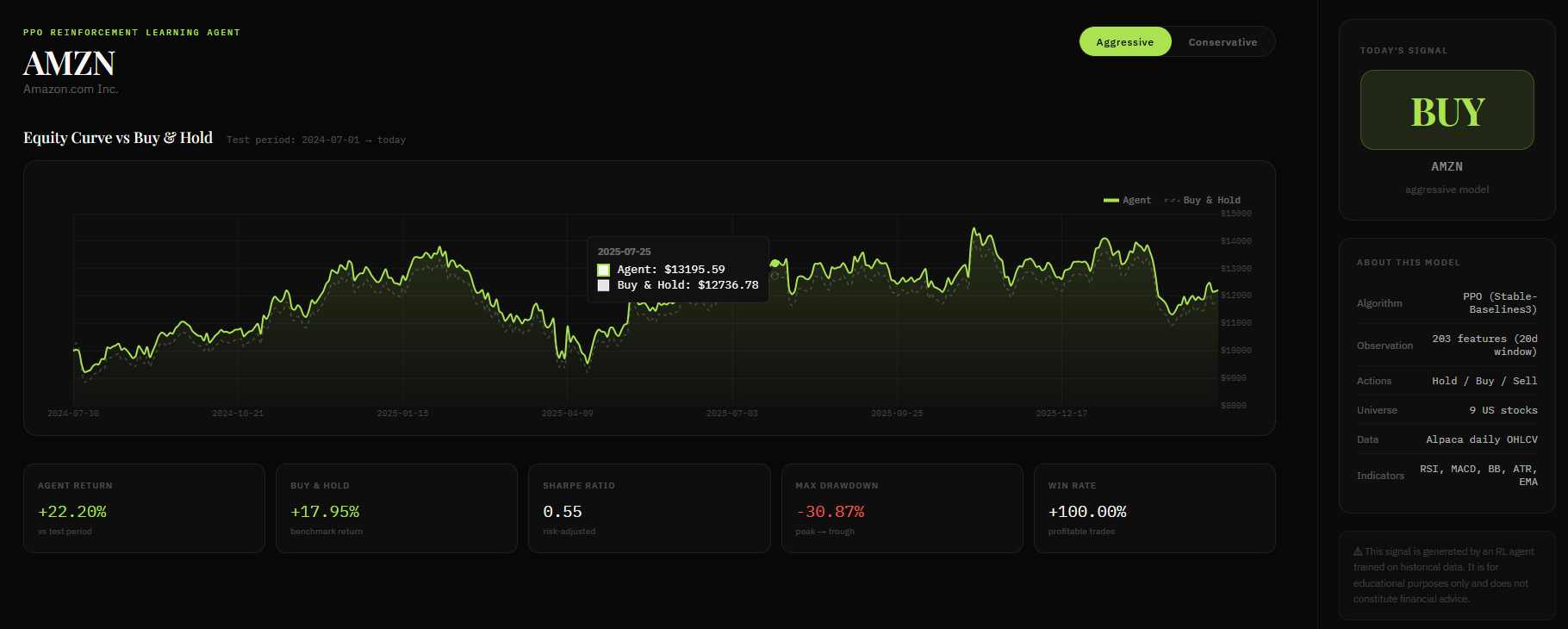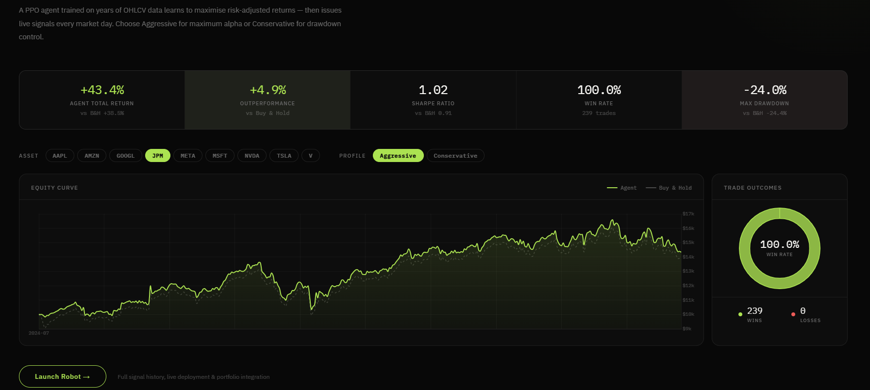 Beyond the daily signal, the robot page runs a full backtest episode — the agent steps through the entire historical dataset and trades autonomously. The results are presented in two ways: