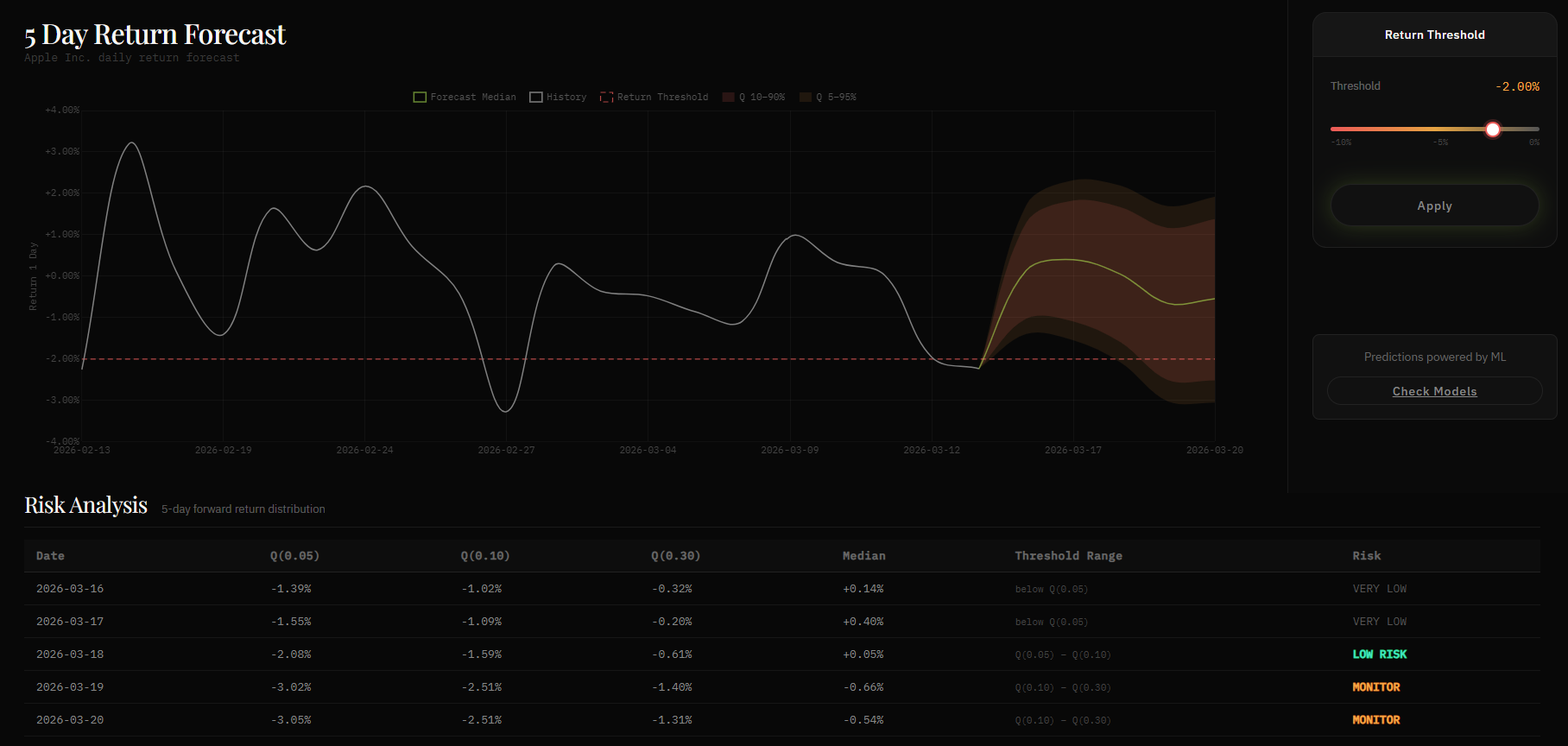 For every ticker, we implemented a machine learning model that predicts daily returns over a 5-day horizon. Users can analyze forecasts for upcoming business days, helping them make informed trading decisions. Predictions are presented as the median expected return, accompanied by quantiles to clearly communicate the uncertainty of the forecast.