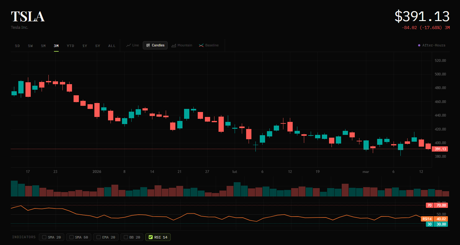 Price analysis using the selected horizon, frequency and candles plot type along with the calculated RSI indicator for Tesla.