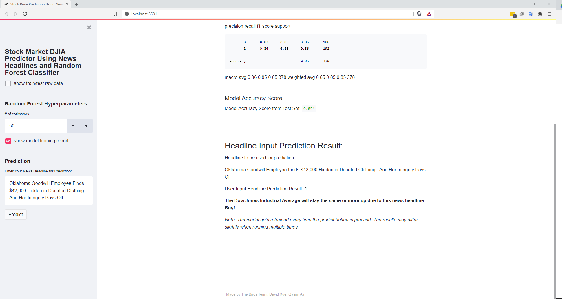 Our dataset contained the top 25 news headlines everyday from 2008-2016 and whether or not the DJIA moved up or down. After cleaning the data, we used the NLTK (Natural Language Took Kit) to process our headline data into data that can be used by our machine learning model. We used the random forest classifier from scikit learn to train our model to predict the DJIA based on a given headline. For our front end, we used streamlit. This allowed us to quickly create our user interface.